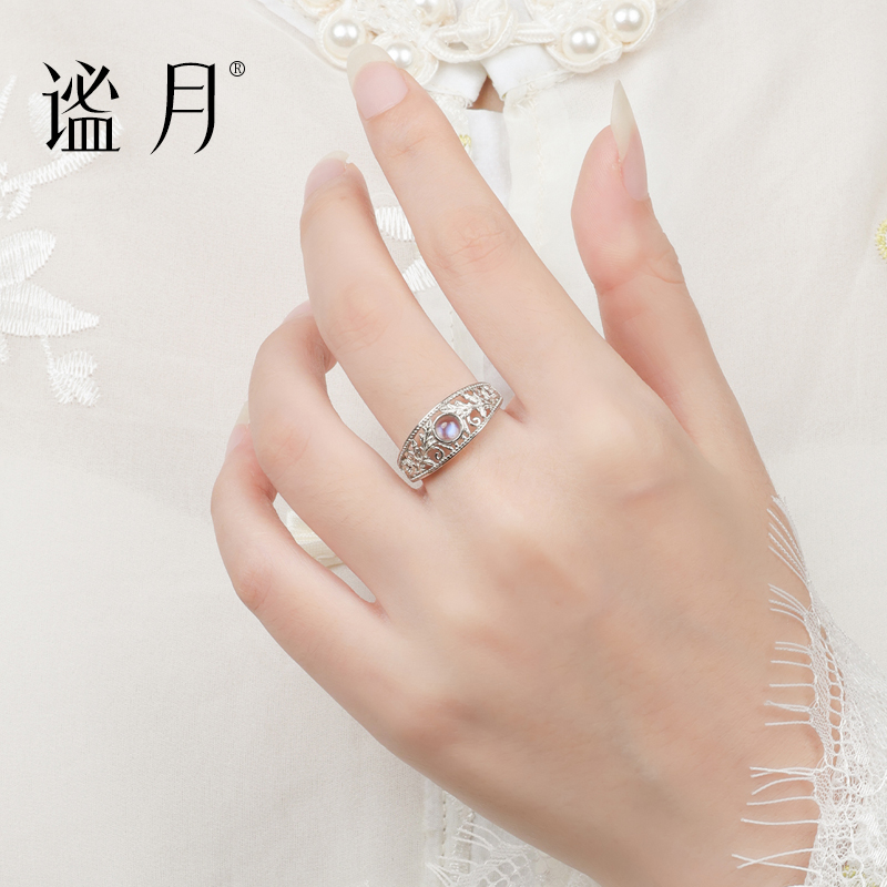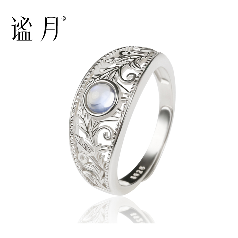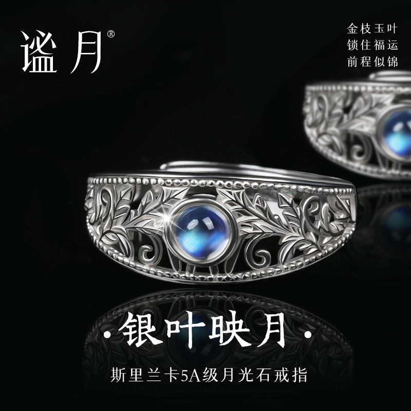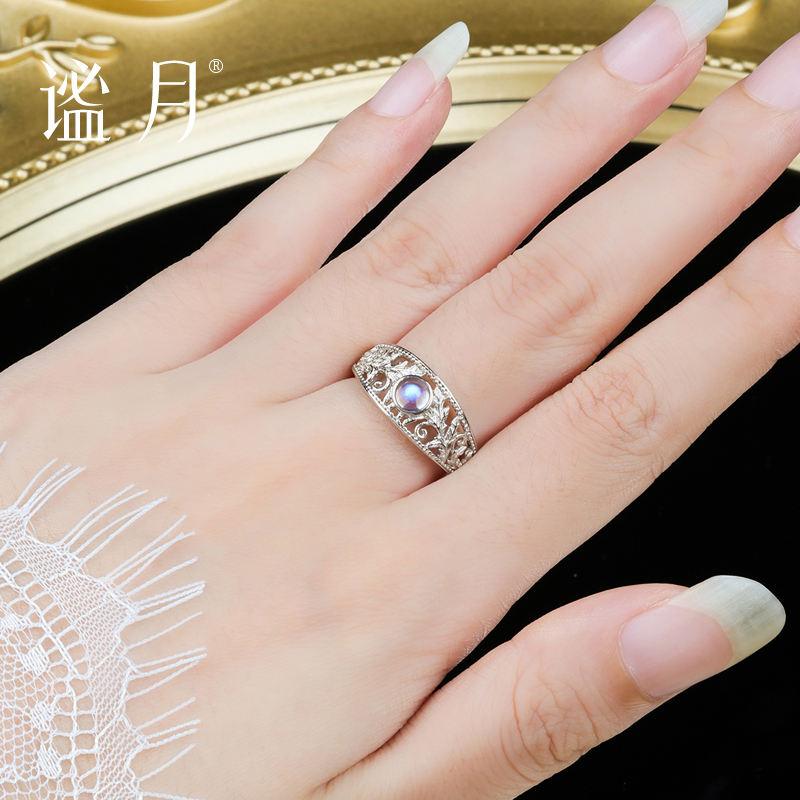 日系轻奢谧月斯里兰卡天然蓝月光植物花卉镂空设计纯银戒指女礼物