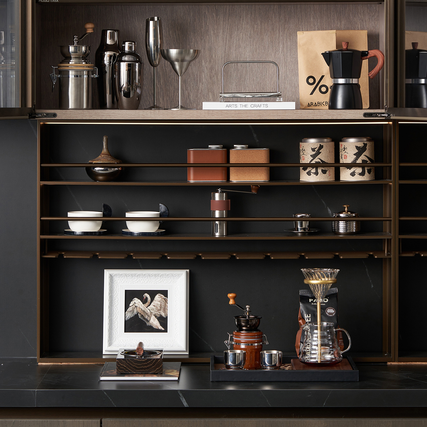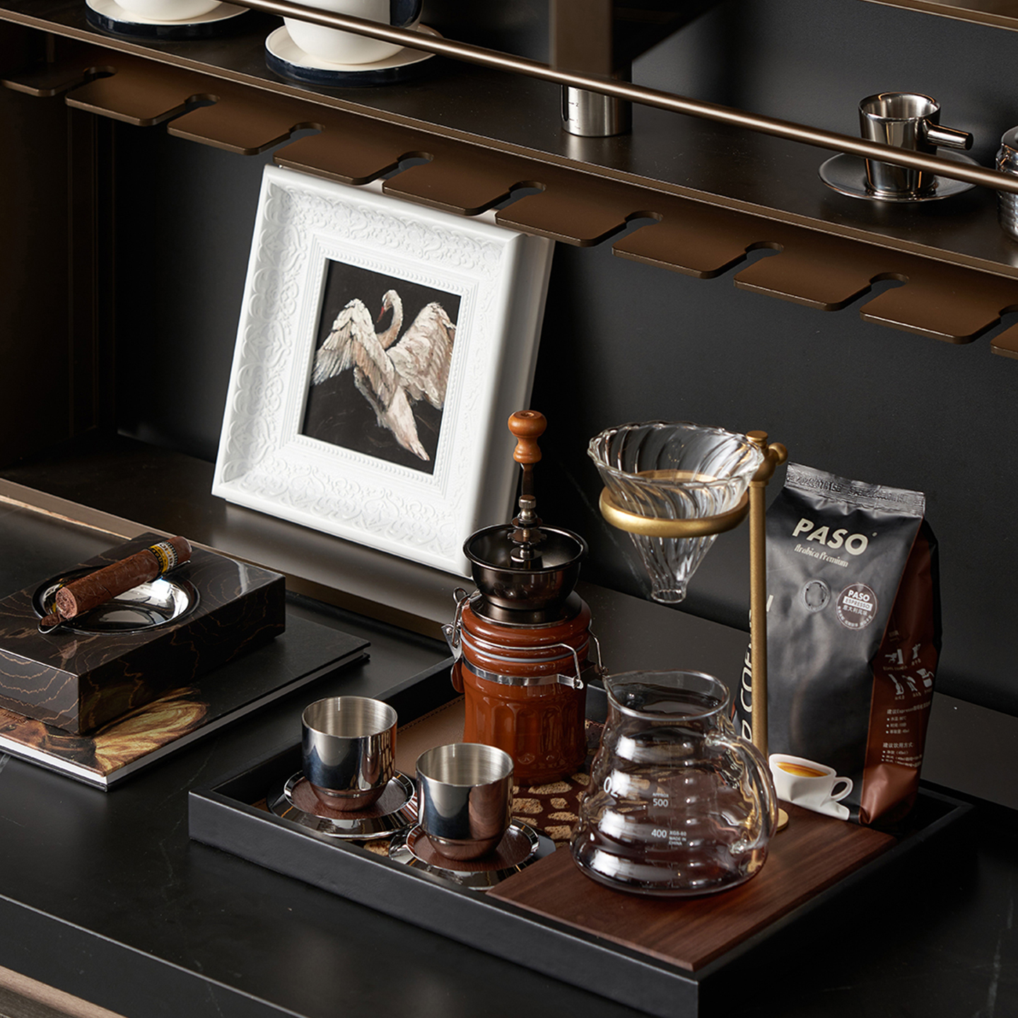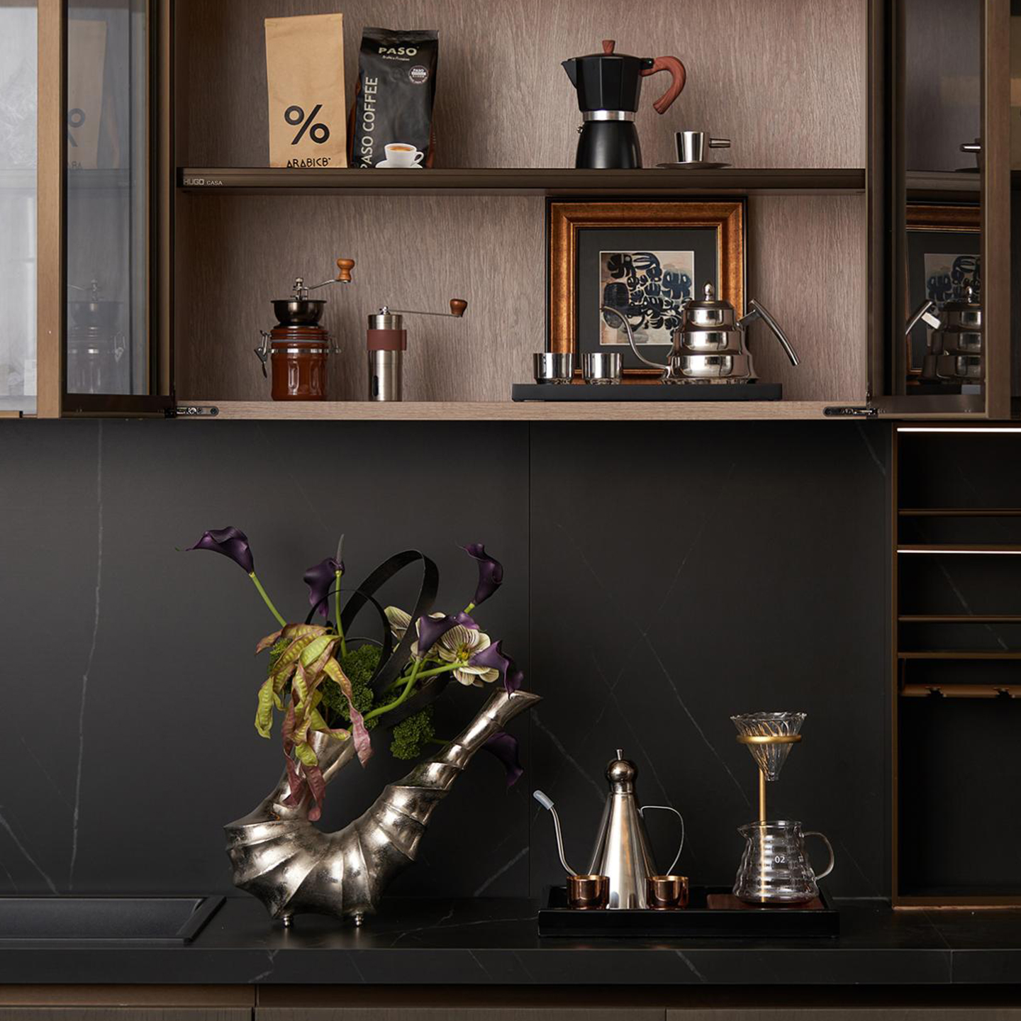 八度空间现代简约样板间售楼处厨房台面咖啡机水壶置物架装饰摆件
