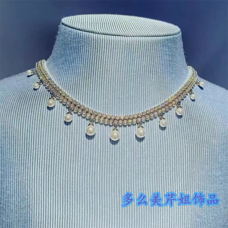 水晶珍珠项链女蓝色同款满钻排钻树叶锁骨链送女生首饰妈妈礼物