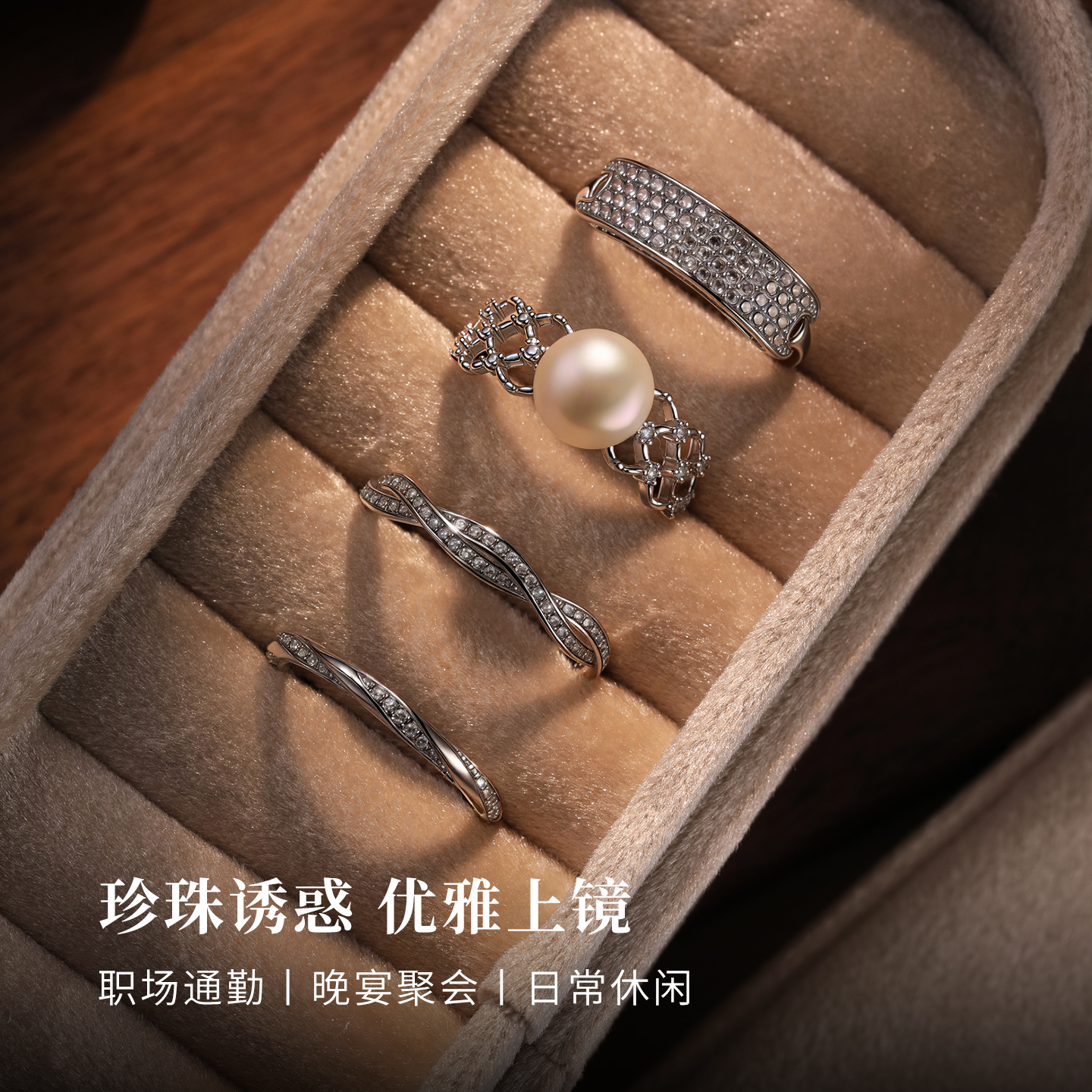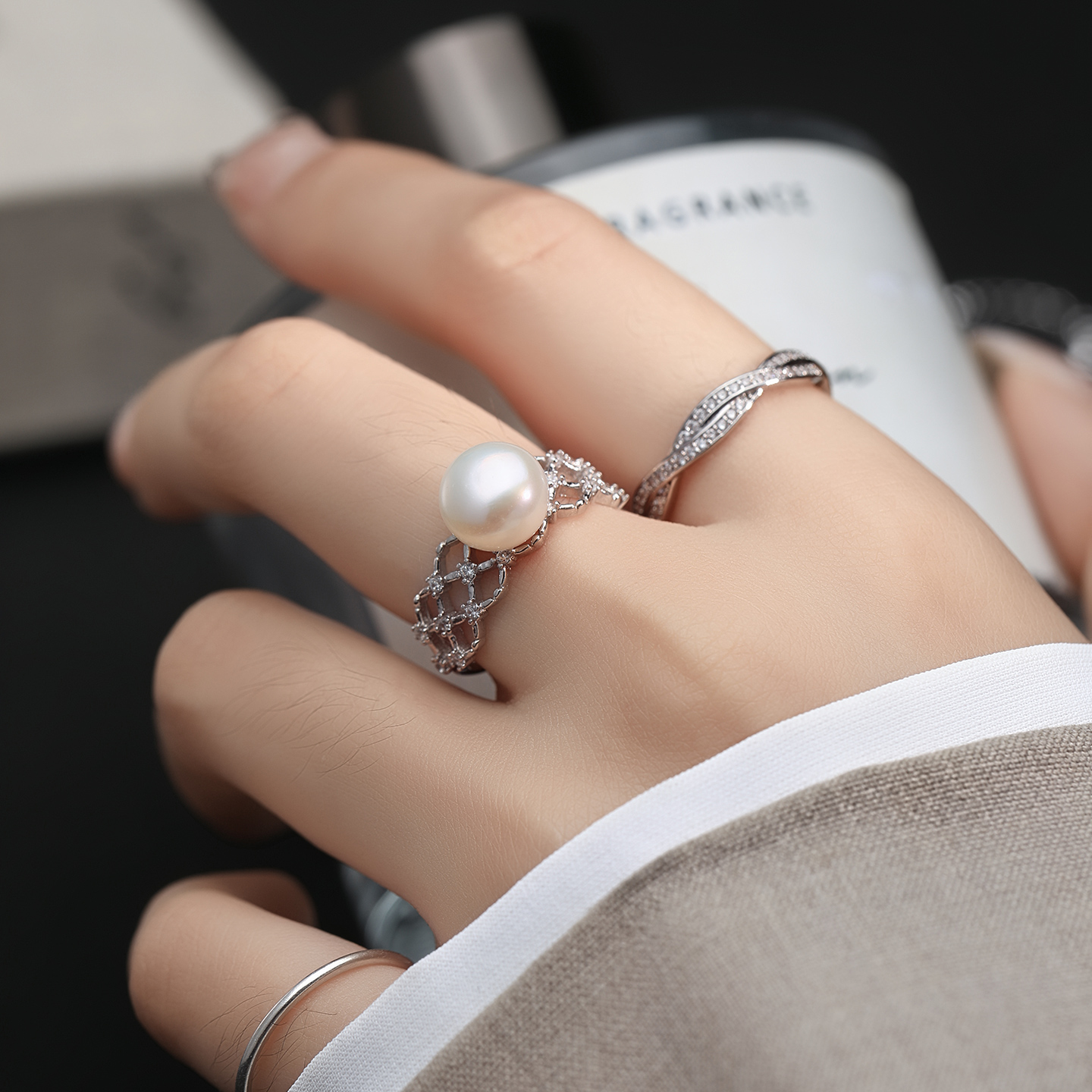 蕾丝珍珠戒指纯银戒指女小众设计锆石戒指开口戒指银饰戒指