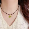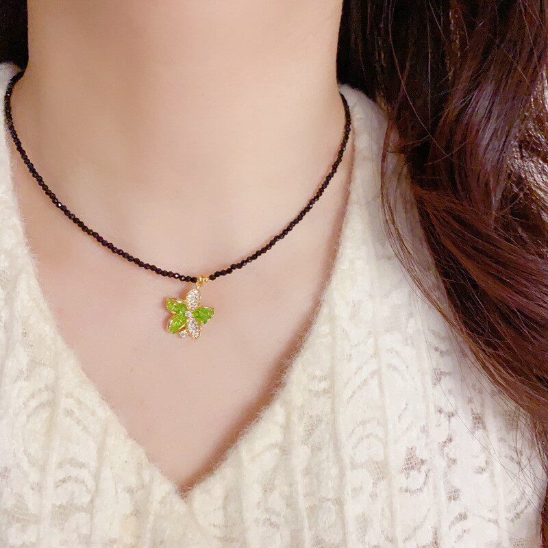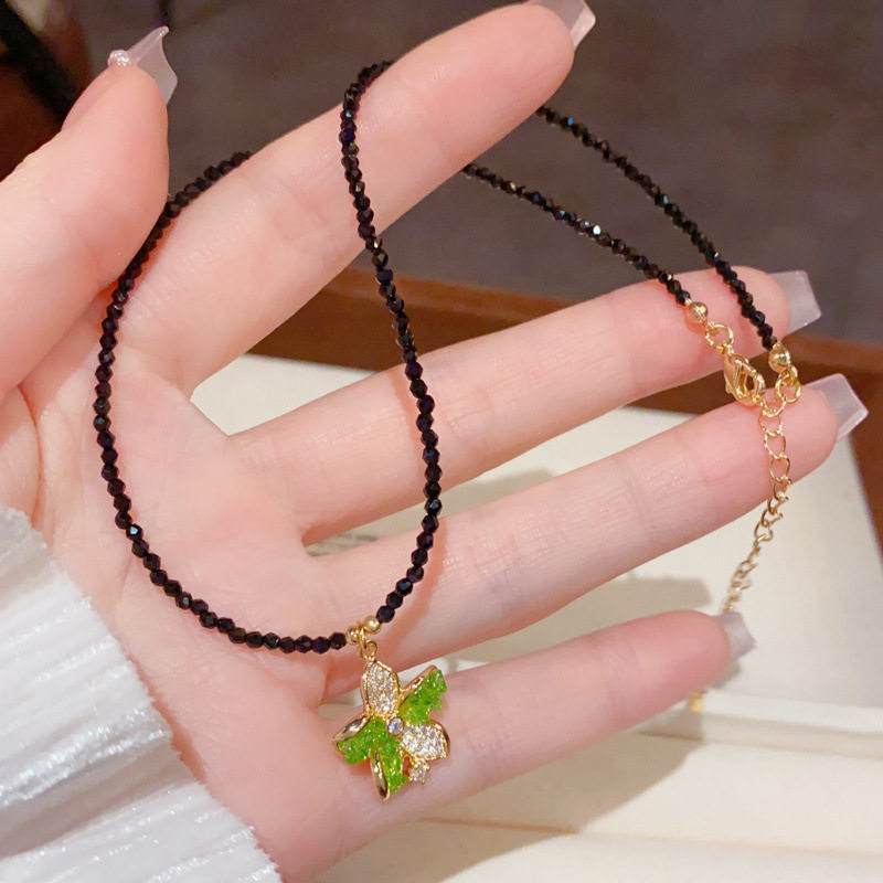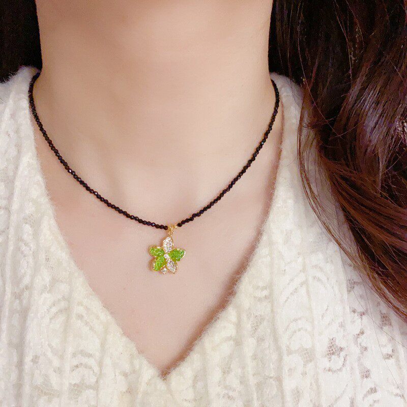 春季新款气质时尚绿色花朵吊坠黑水晶项链个性轻奢百搭设计感颈链