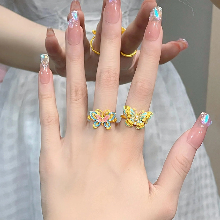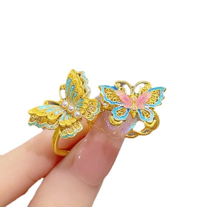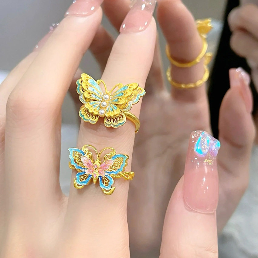 新中式古风金花边紫色粉色蝴蝶戒指女仿925纯银镶嵌珍珠可调节