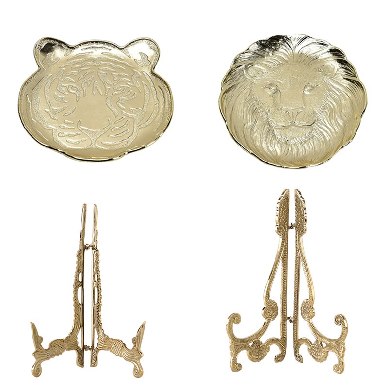 印度进口锡合金立k体浮雕老虎狮子首饰收纳盘摆件黄铜展示支架装