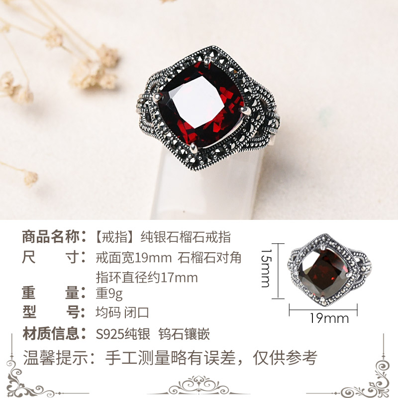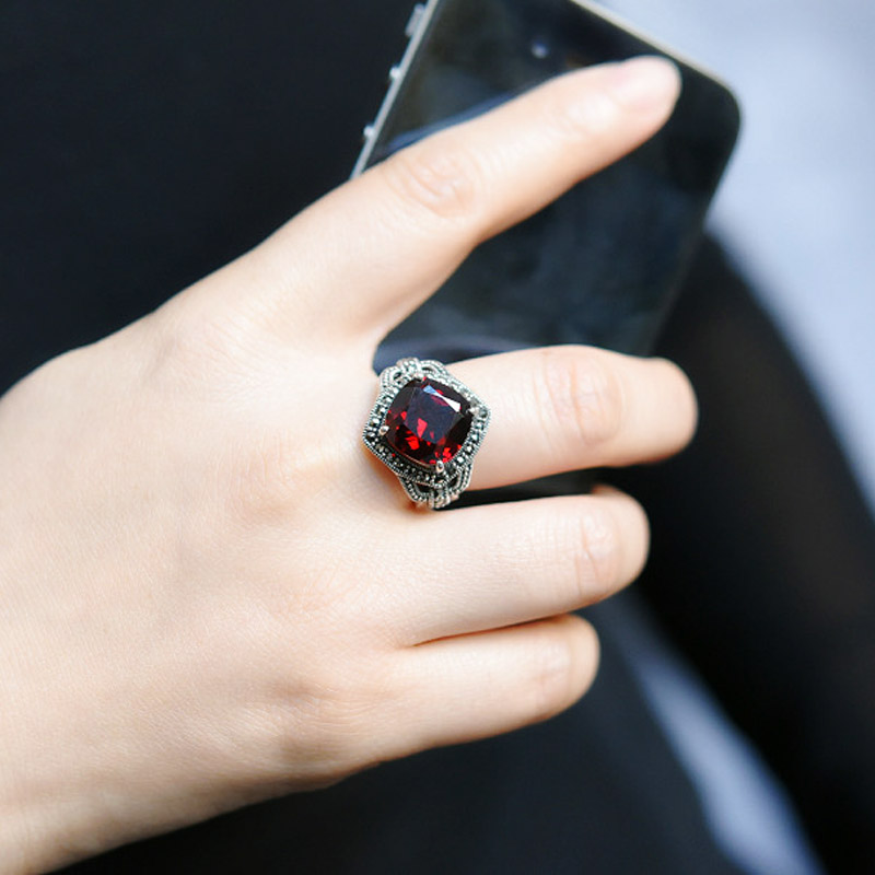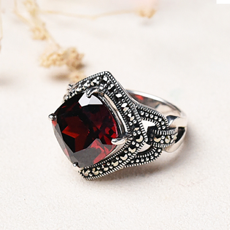 原创小众设计戒指女网红纯银大红宝石宫廷文艺复古方石榴石食指环