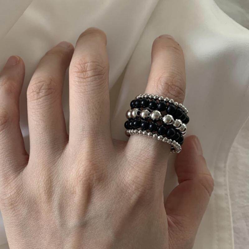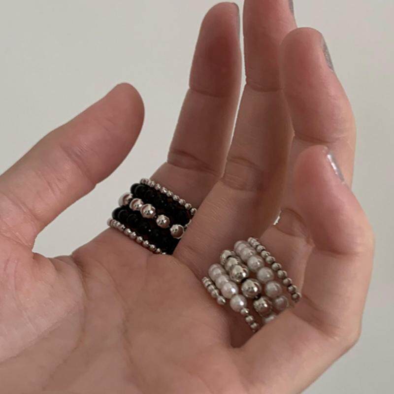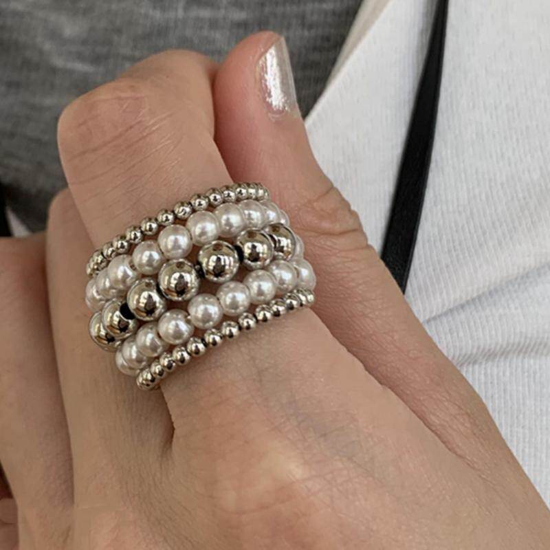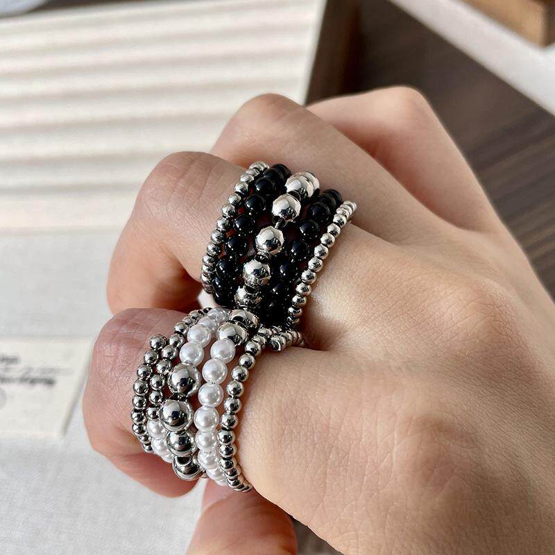 复古多层缠绕金属圆珠球珍珠手工指环戒宽版食指戒夸张指环潮戒指