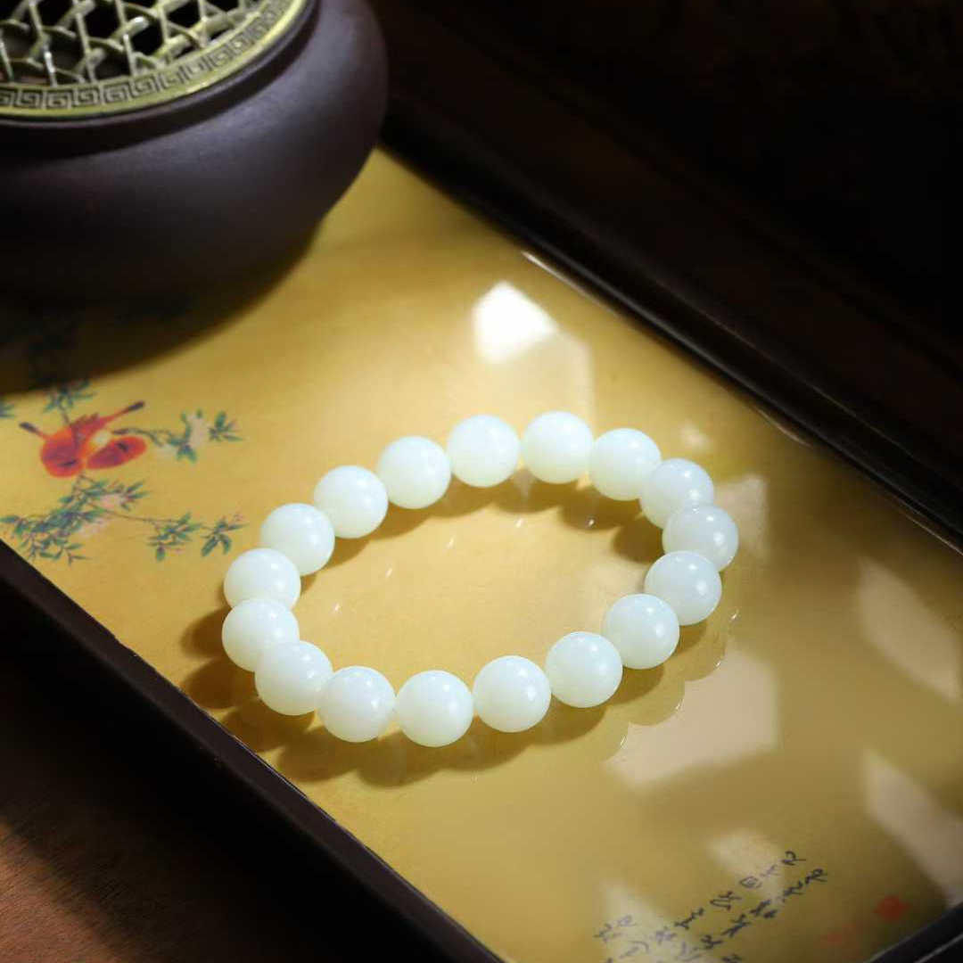 玉器工艺品天然新疆和田玉俄料老料珠圆玉润男女玉石手串附证书