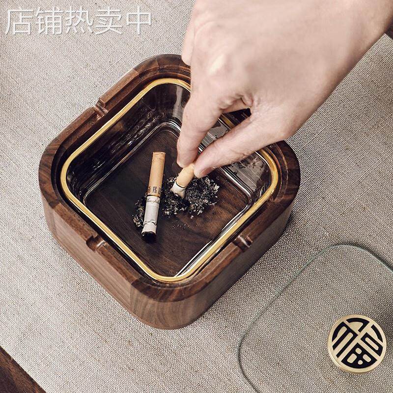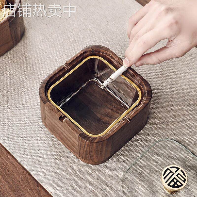 胡桃木实木烟灰缸家用客厅带盖防飞灰创意办公室玻璃高端灰缸轻奢