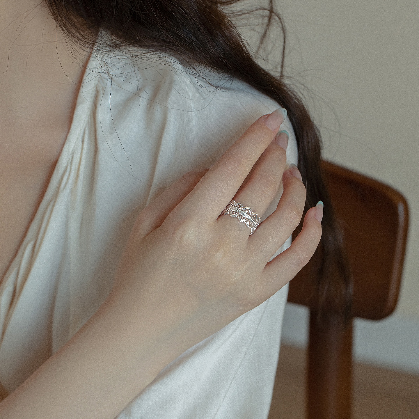 小众时尚S925纯银精美镂空花丝蕾丝宽面刺绣戒指开口复古百搭指环