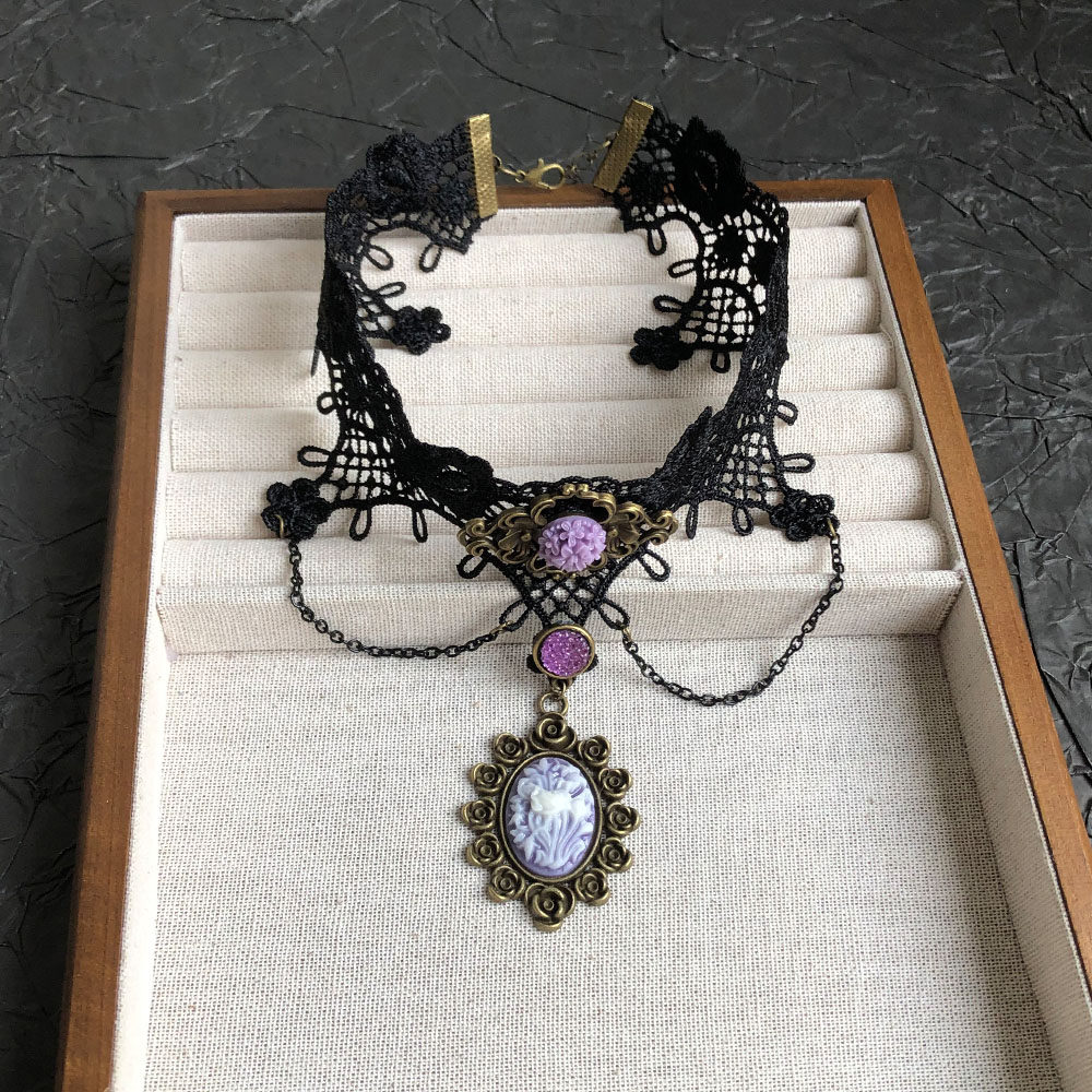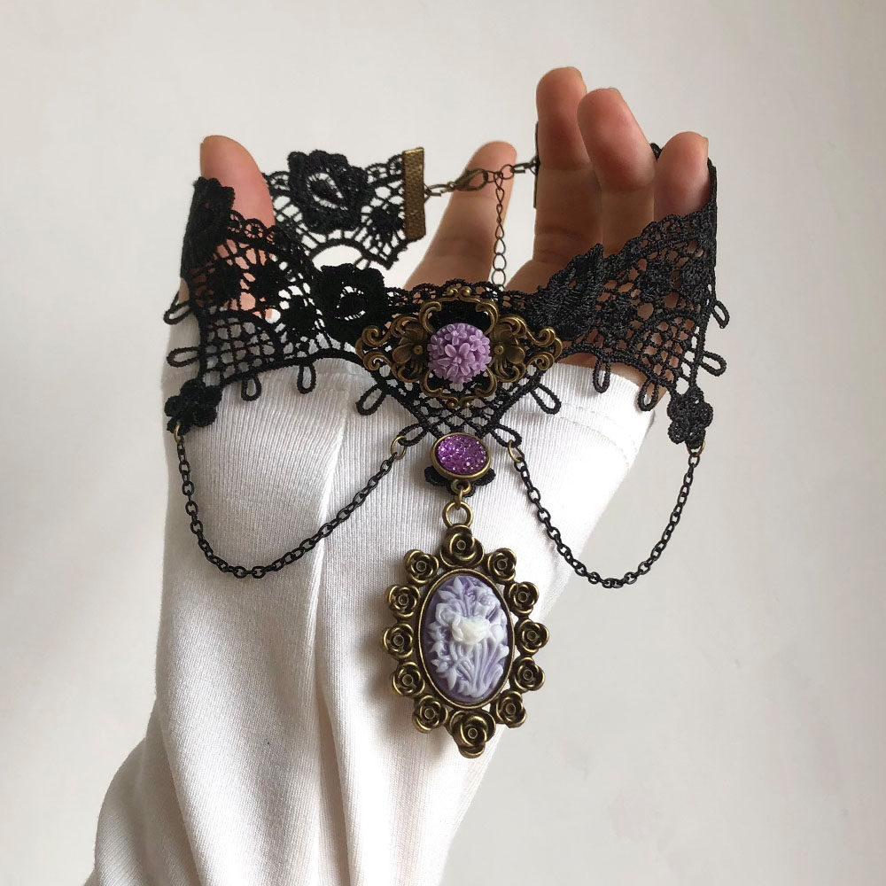 紫色花朵蕾丝流苏黑色项链复古小众choker嘻哈个性精致锁骨链颈链