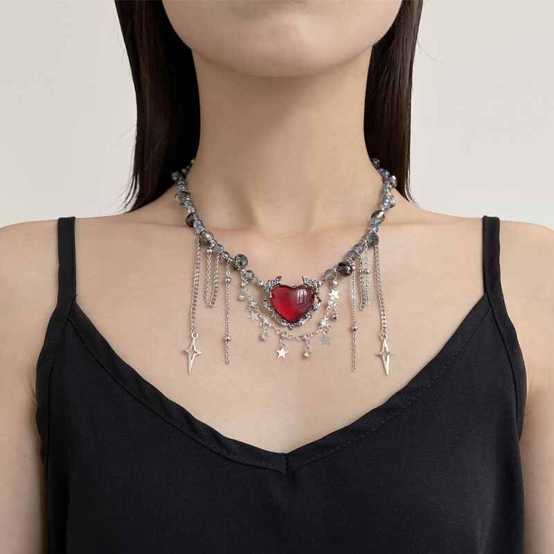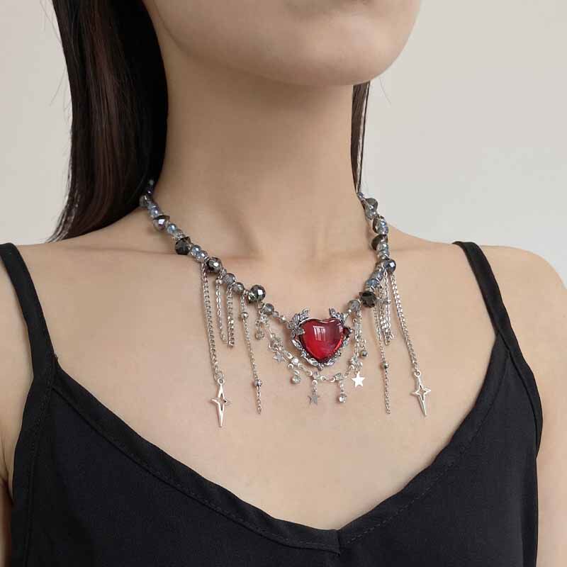 欧美重工红色爱心星星流苏水晶串珠项链女甜酷辣妹朋克风锁骨颈链