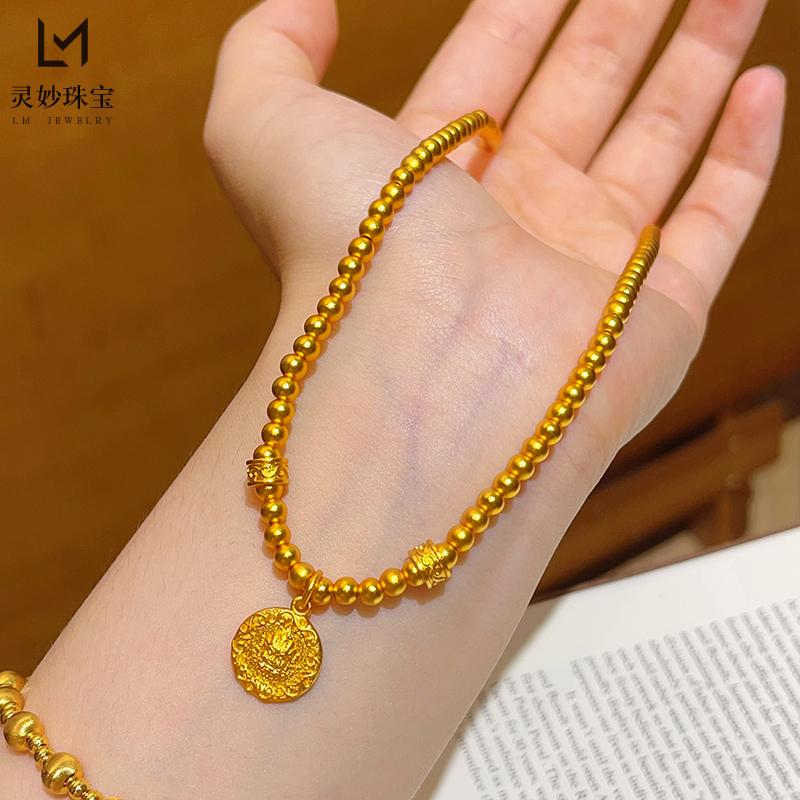 新中式复古沙金六字真言黄财神三圈手链唐草纹转运珠手串送女友礼