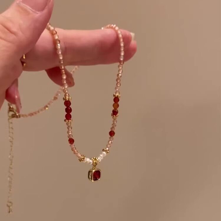 新中式天然石串珠项链女款复古红色吊坠甜美小清新淡水珍珠锁骨链
