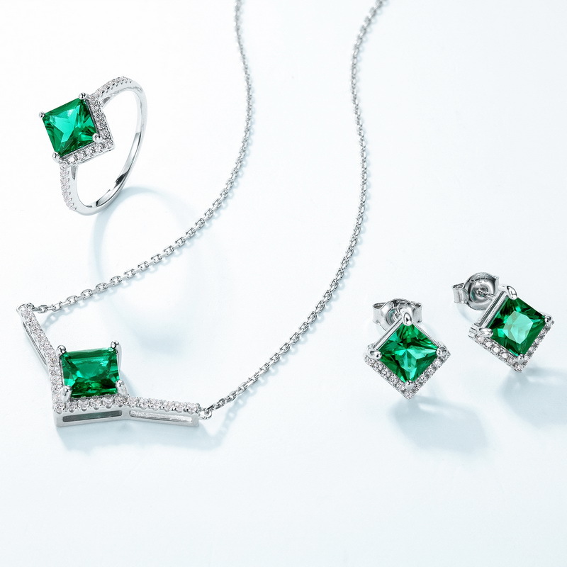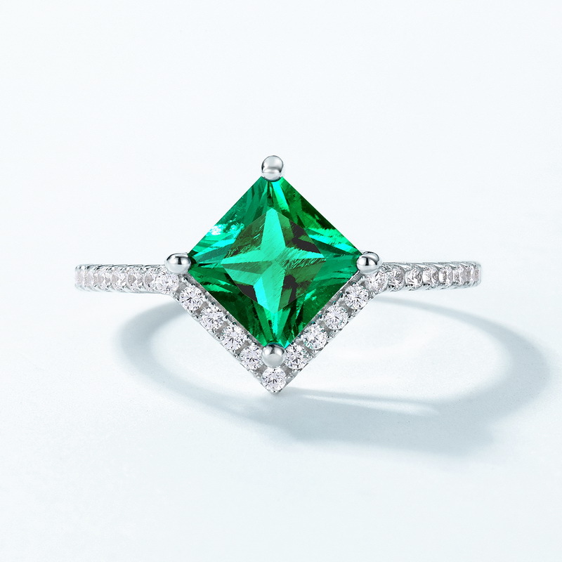 几何公主方培育祖母绿戒指S925银镀18K金镶嵌彩宝宝石指戒时尚