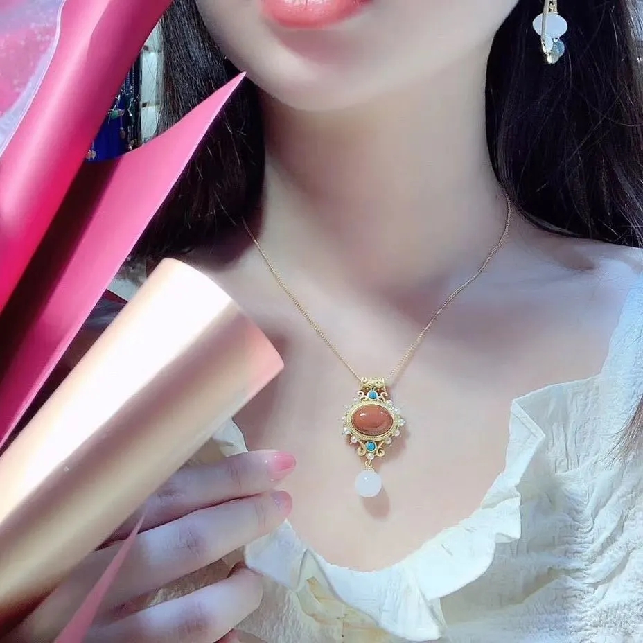 南红玛瑙蛋面吊坠项链女点缀珍珠白玉绿松镀18K金宫廷复古风套装