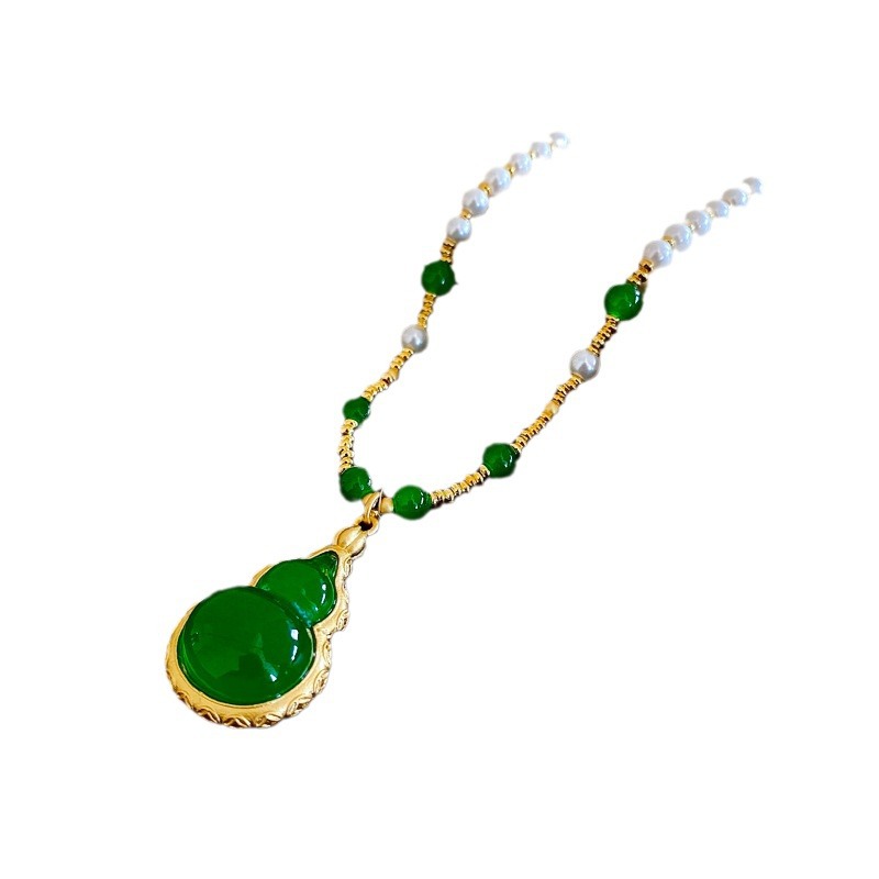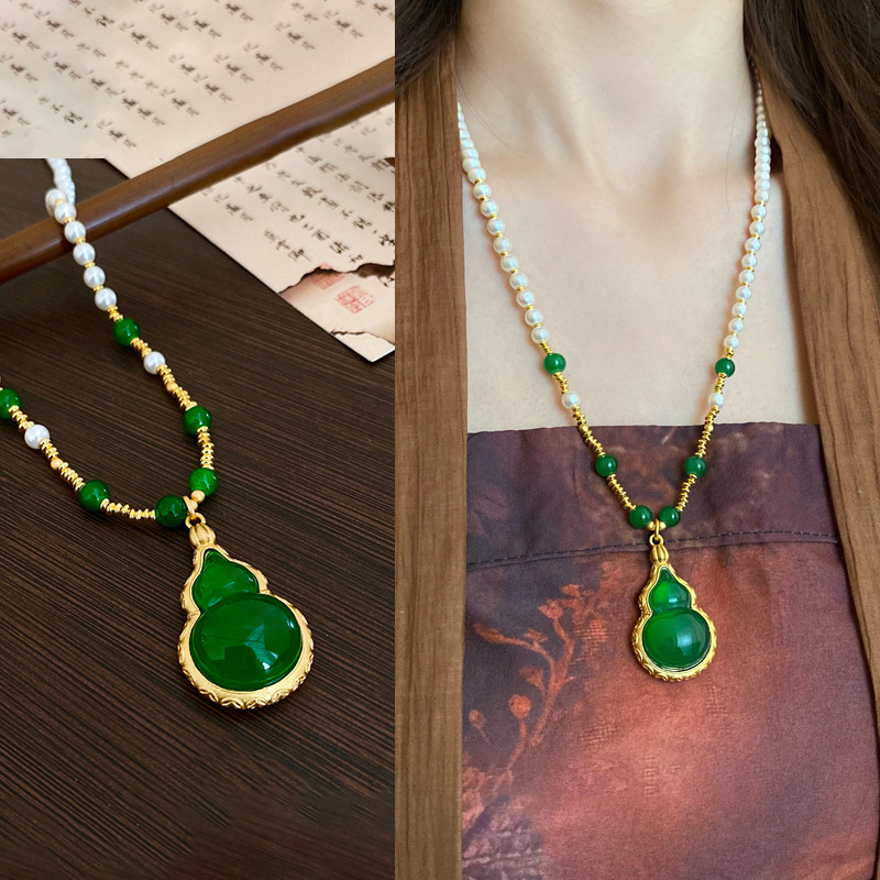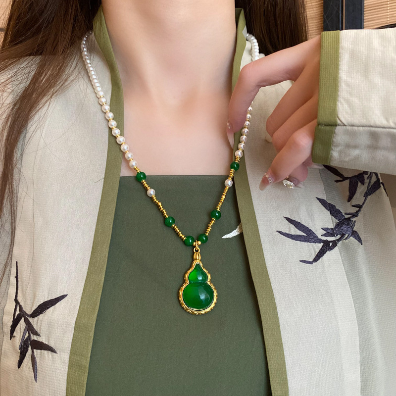 复古绿色葫芦吊坠新中式国风项链珍珠长款古风旗袍配饰女感