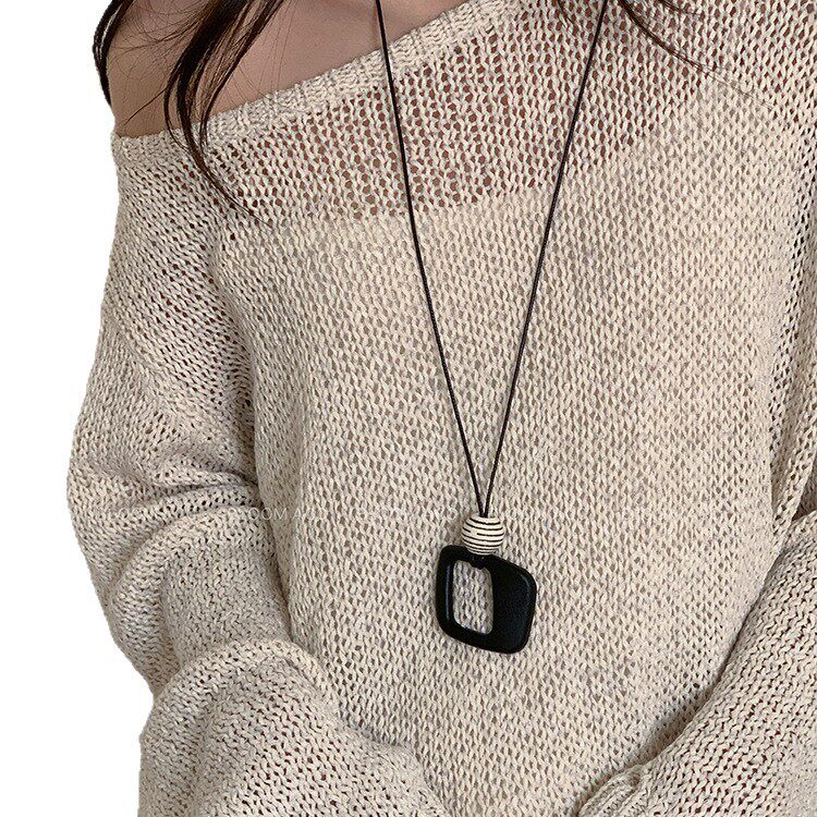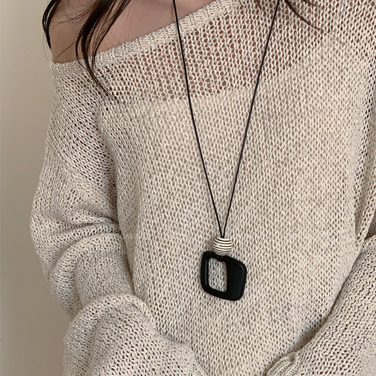 清冷黑色系复古树脂几何圆形菱形吊坠项链民族风长款黑色绳毛衣链