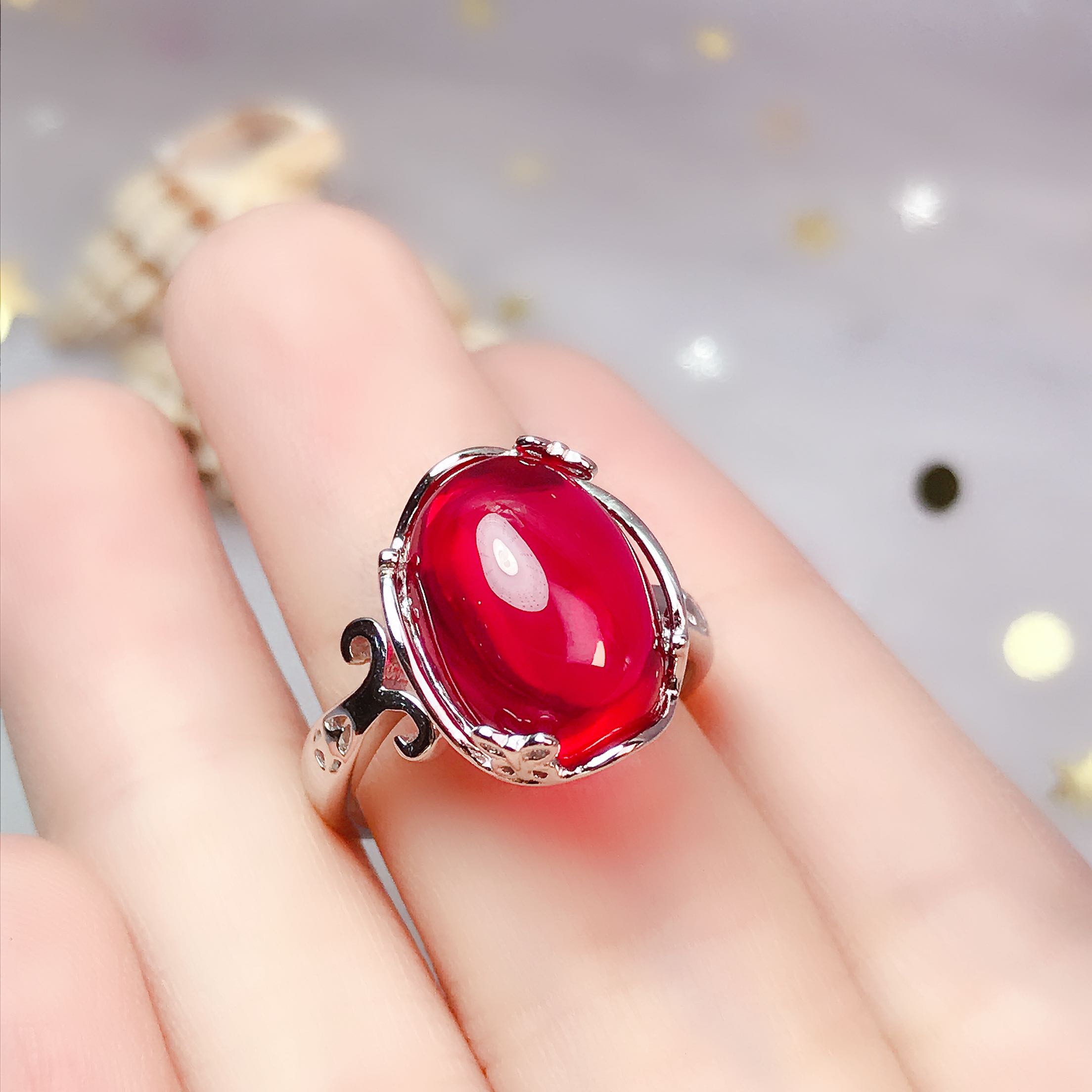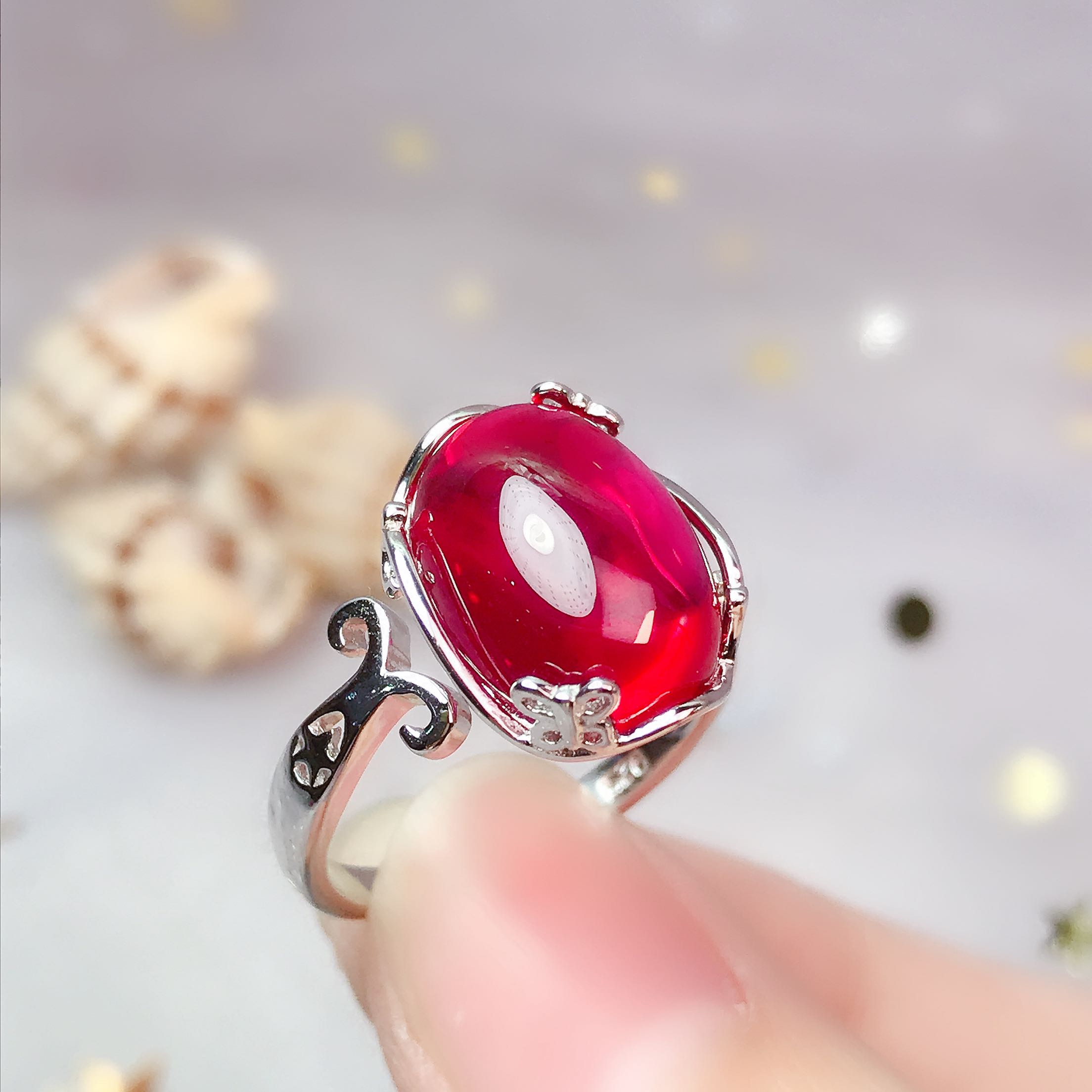 红色宝石水晶红刚玉戒指女开口戒925纯银饰电镀18K金镶嵌日韩礼物
