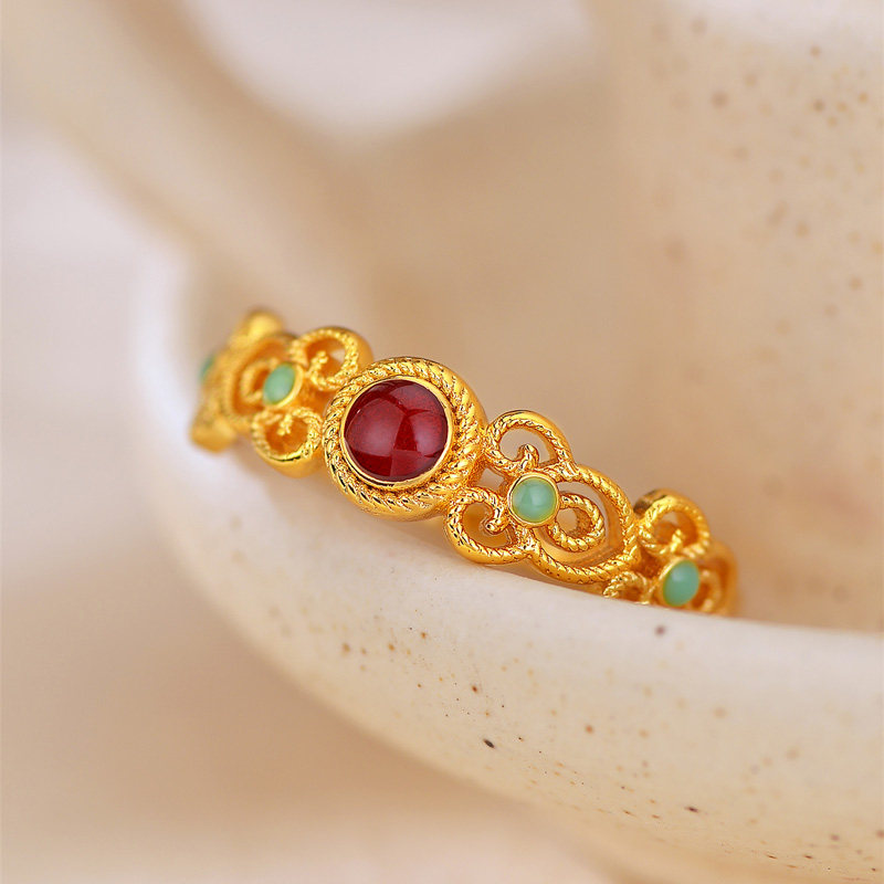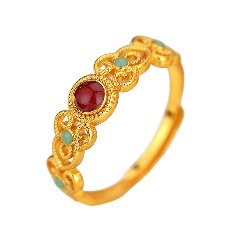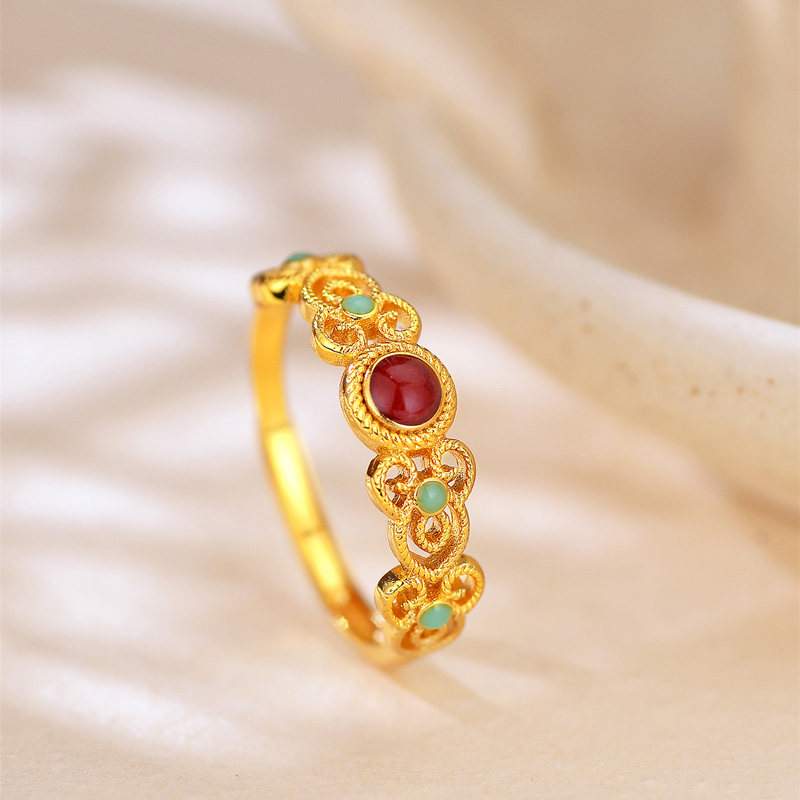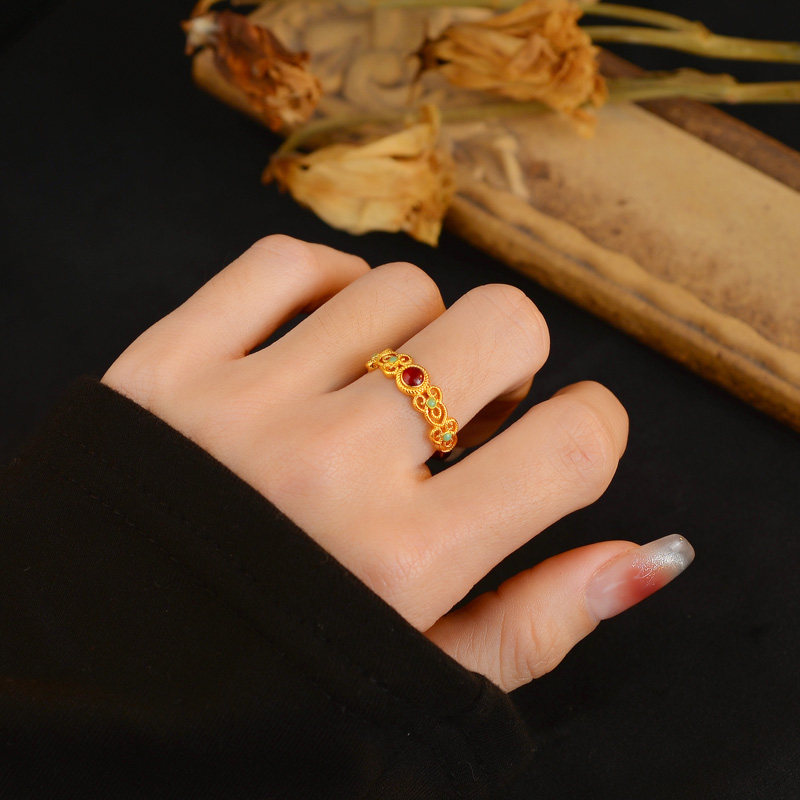 新中式镀黄金色戒指女国风珐琅花丝戒指鎏金高级感开口可调节指环