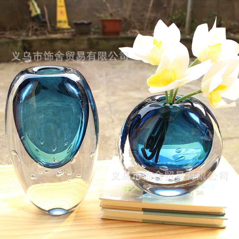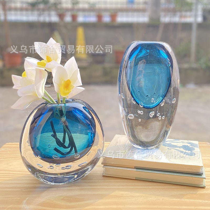 蓝色透明水晶玻璃l花瓶摆件轻奢样板间客厅餐桌茶几水培琉璃花器
