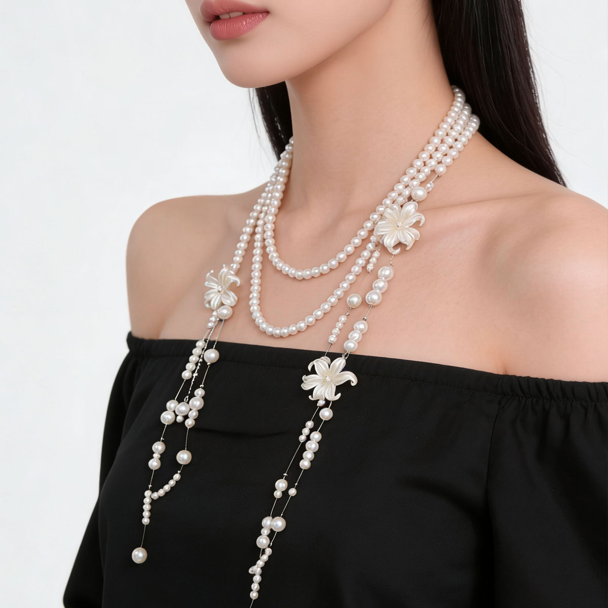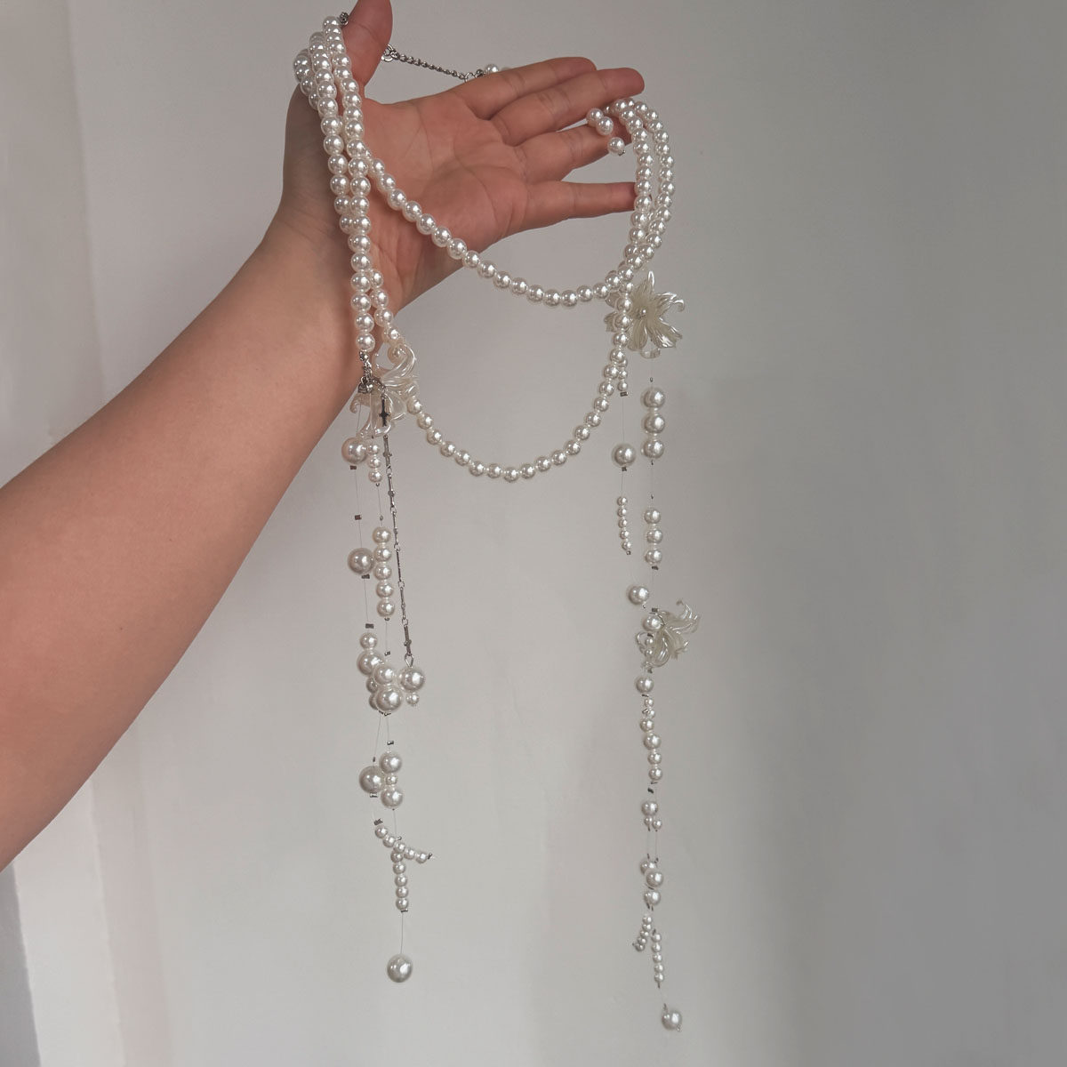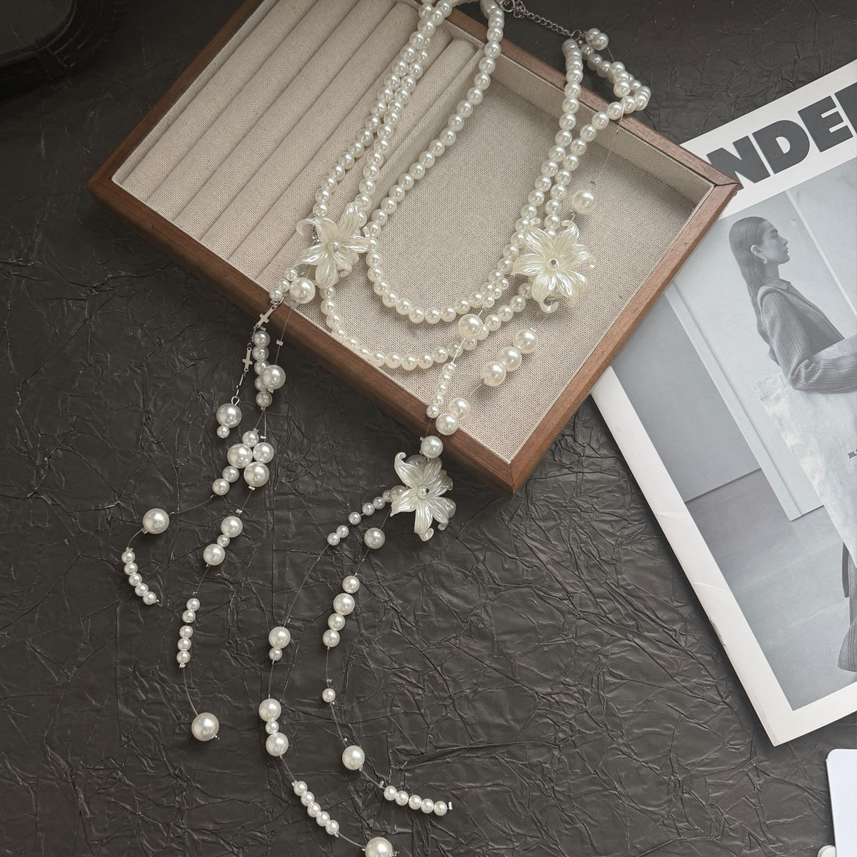 法式浪漫白色贝壳花朵珍珠流苏项链女小众多层串珠气质锁骨链颈链