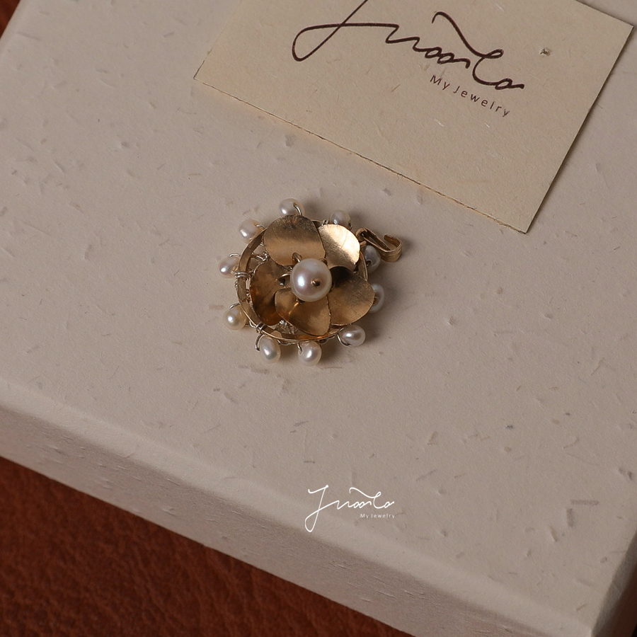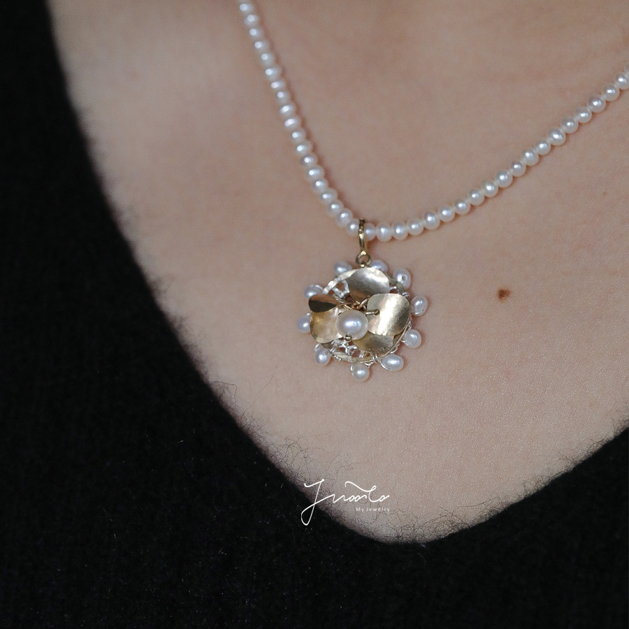 JWOOCO古典浪漫风原创纯手工花朵美国14K注金真珍珠999银项链吊坠