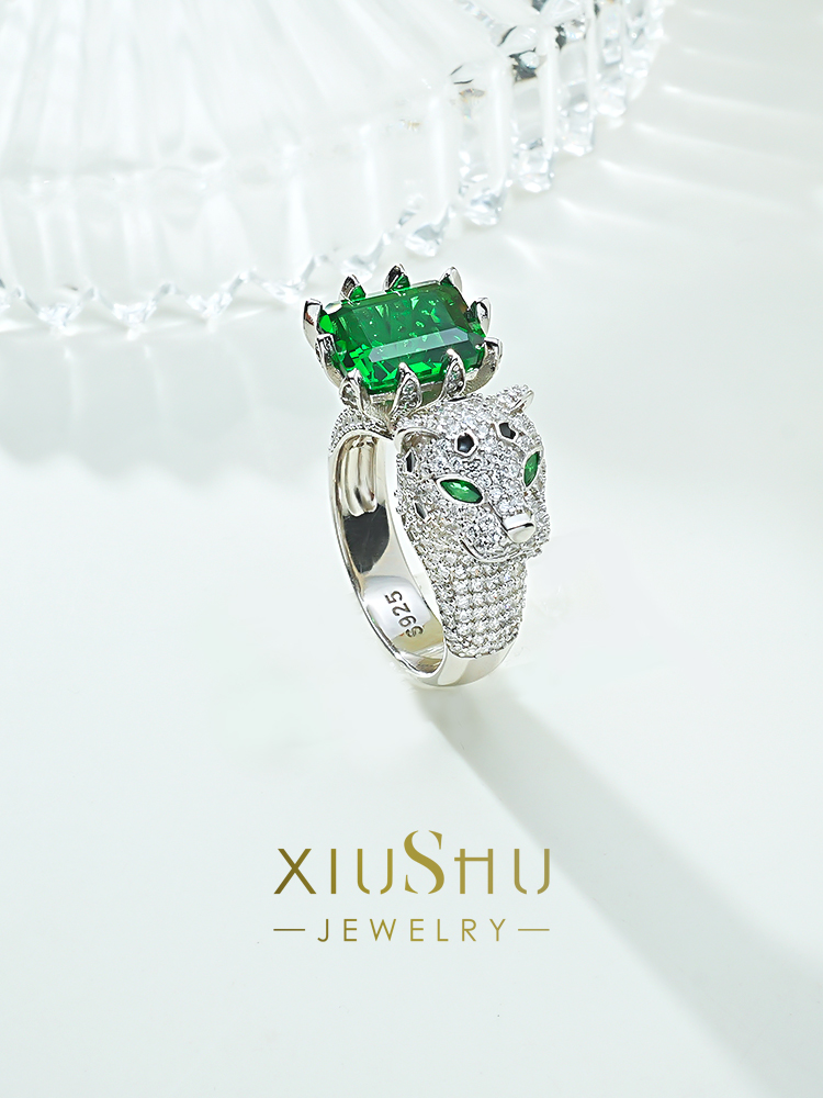 重工祖母绿色豹子925纯银戒指镶嵌高碳钻满钻气质小众设计百搭