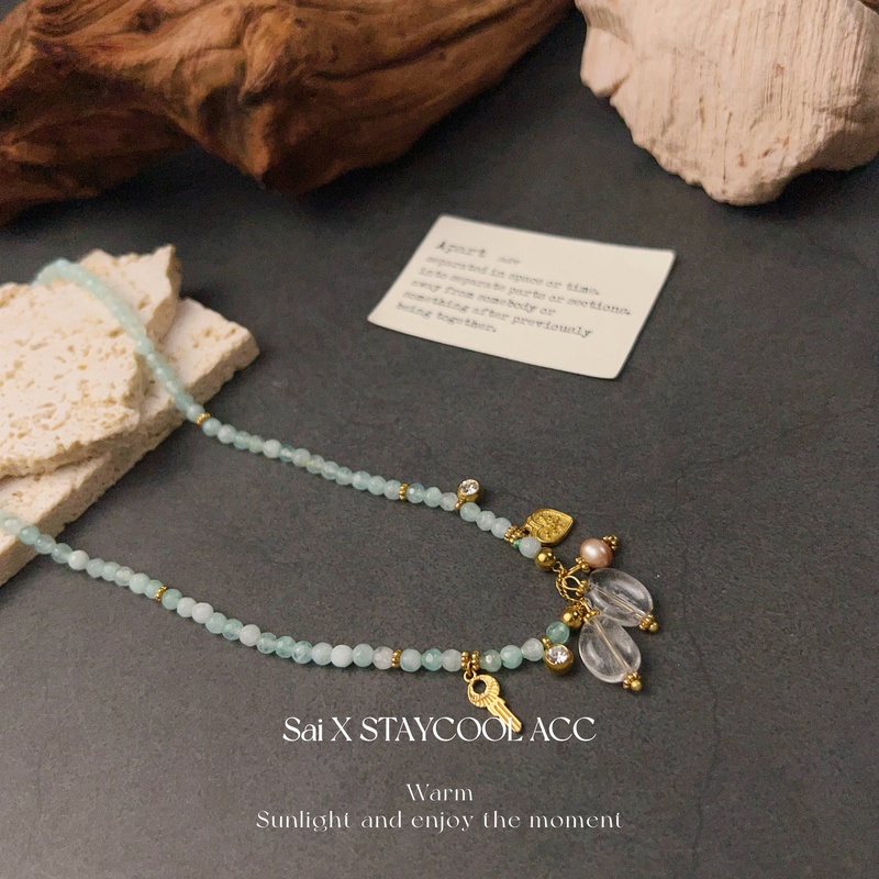 海岛度假风海蓝色天然石白水晶爱心钥匙女士项链北欧高级感锁骨链