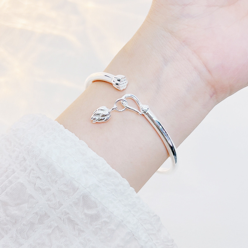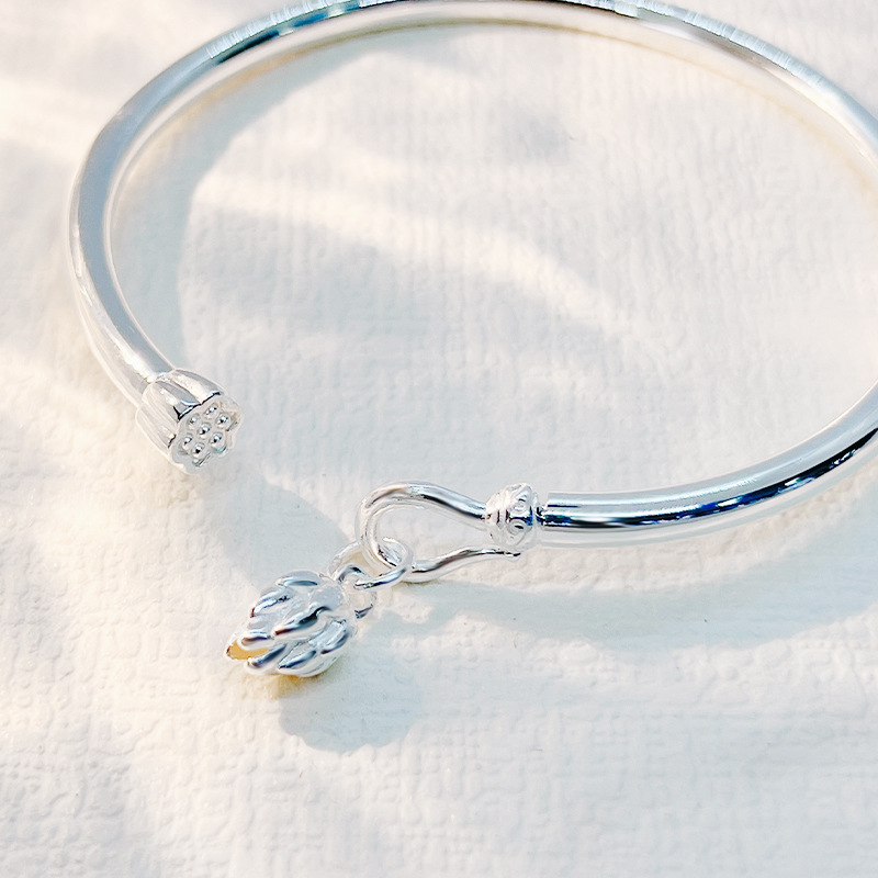 银镯子新款送女友手镯女传承复古款实心开口莲子莲花9999足纯银
