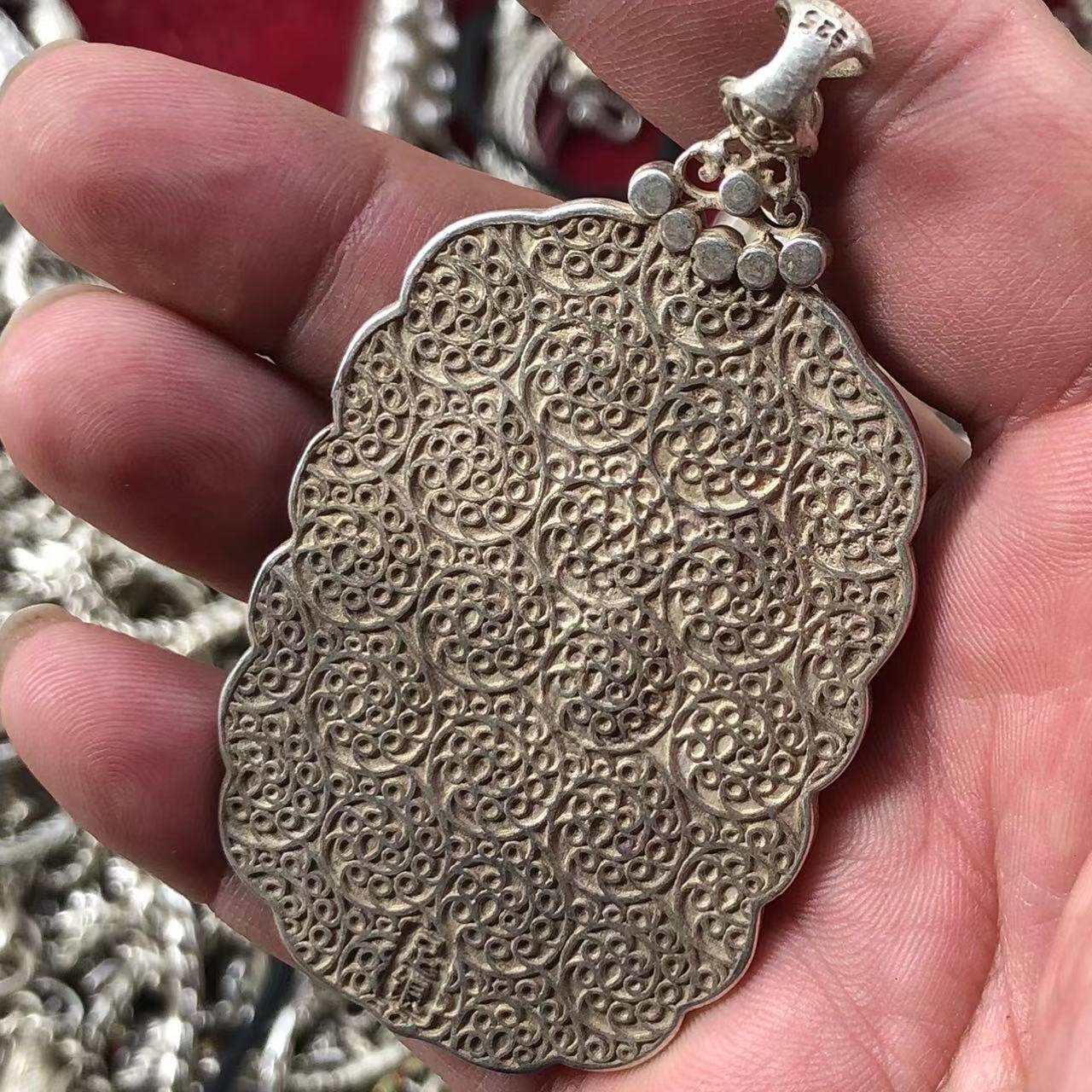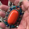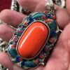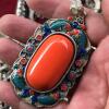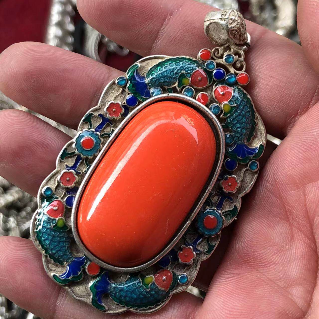 古玩杂项复古做旧藏银镶嵌景泰蓝红色玉方牌吊坠挂件工艺品