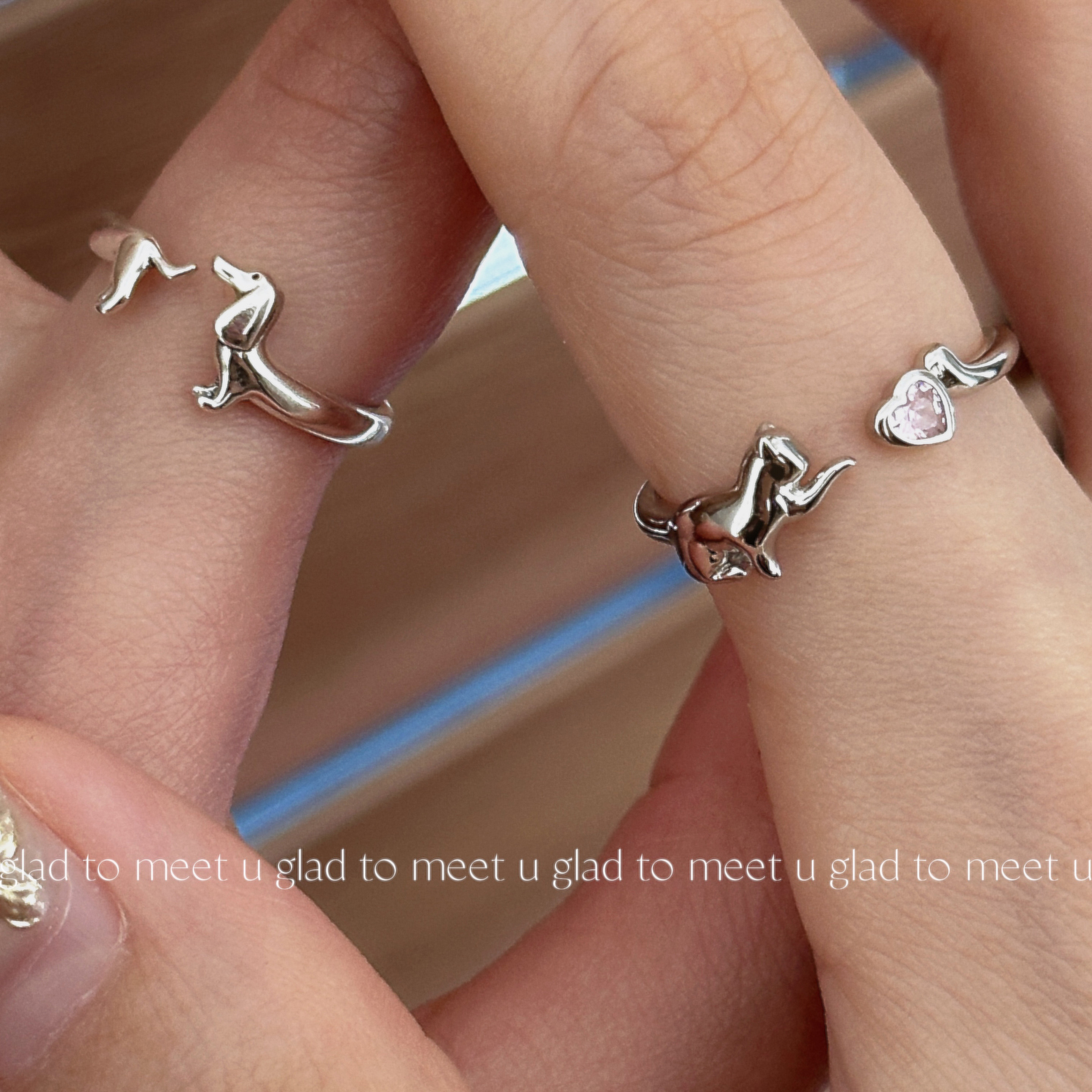 glad to meet u可爱小狗腊肠狗猫咪戒指女s925纯银开口可调节指环