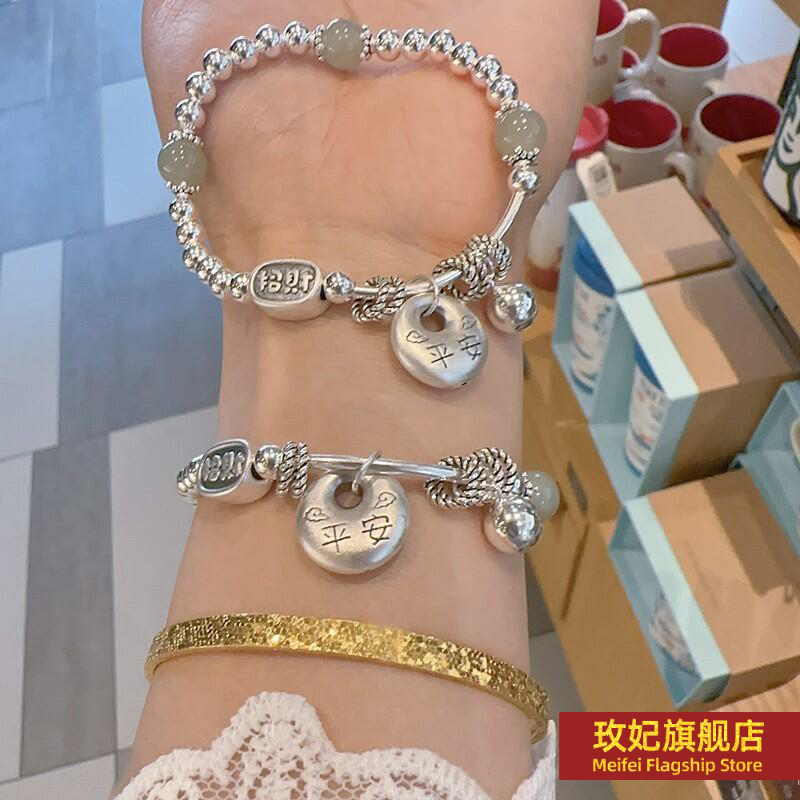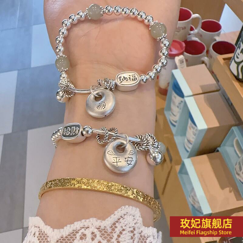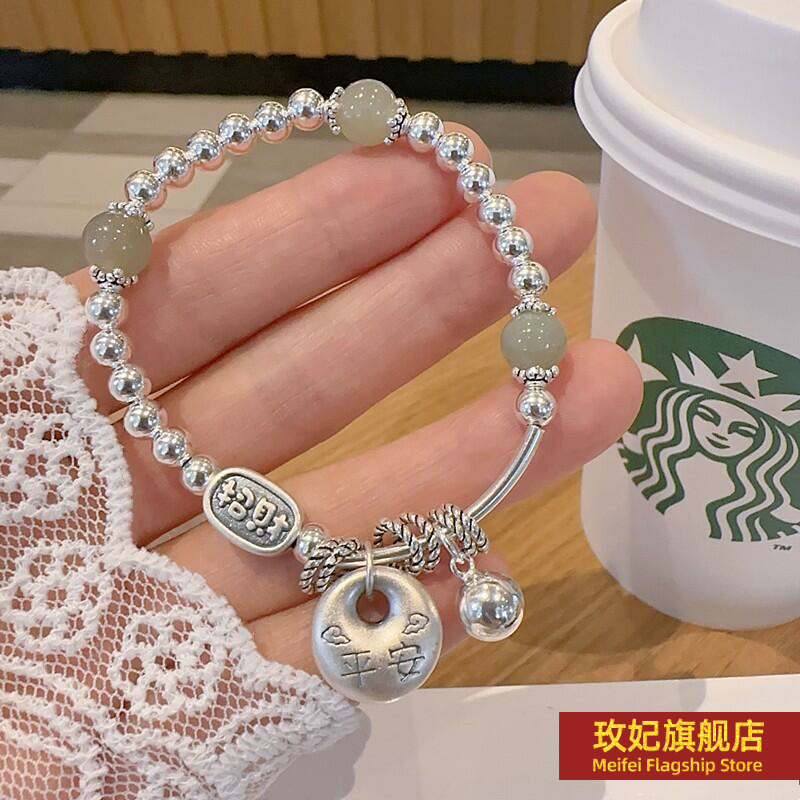 正生纯银纯银天然和田玉招财纳福平安铃铛纯银手链礼物刻字手串送