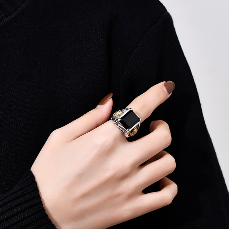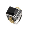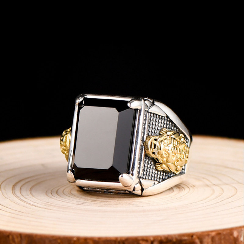 新品复古金色貔貅戒指男士潮黑色石头霸气个性国潮风宽面食指环