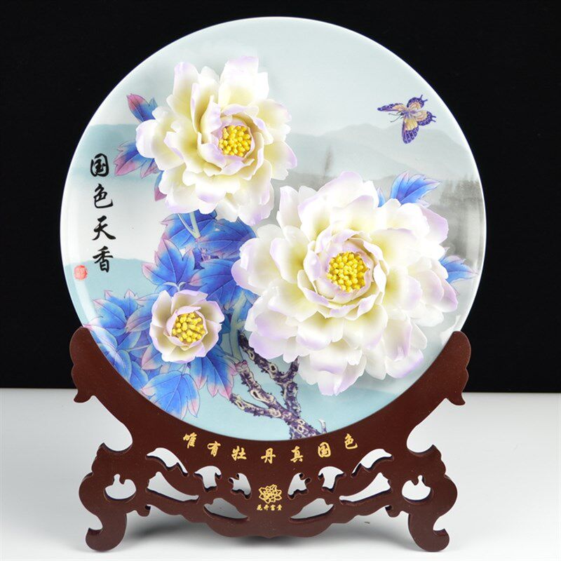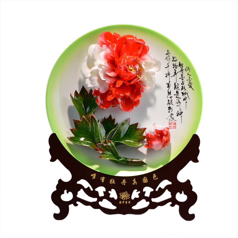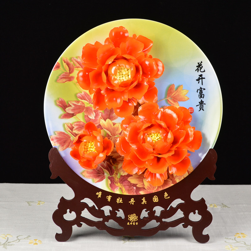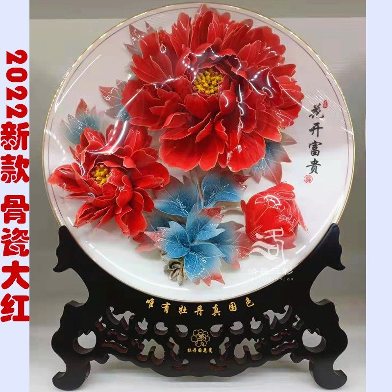 精品14寸洛阳牡丹瓷盘摆件手工艺术陶瓷花新房装饰送长辈老师礼品