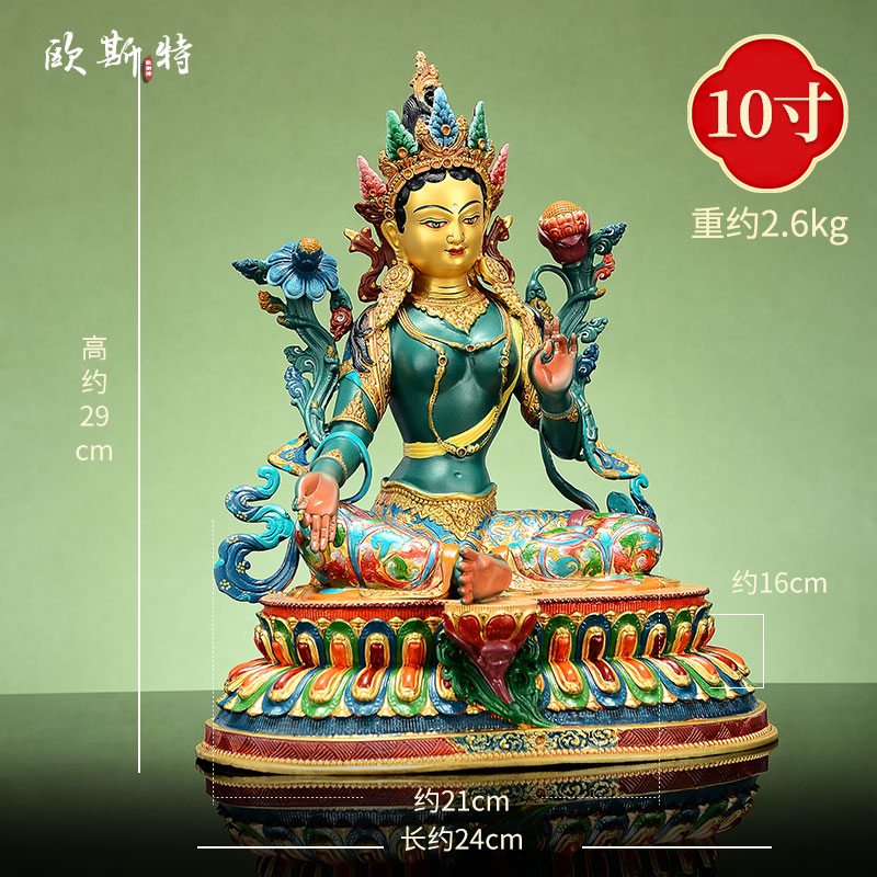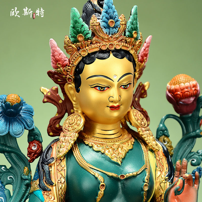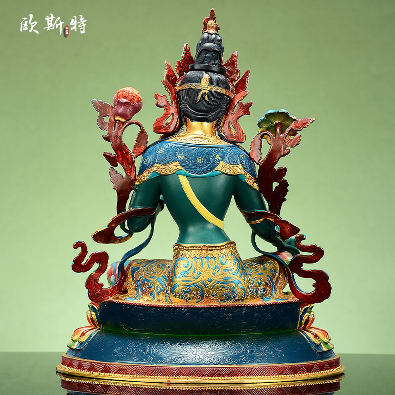 欧斯特彩绘《绿度母》室内家用精工铜雕《绿多罗观音》铜像摆件