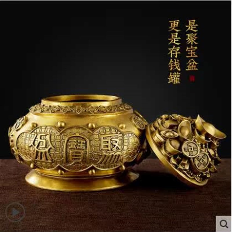 铜聚宝盆纯铜聚宝盆摆件桌面带盖开盖招财聚财五路财神聚宝盆家居