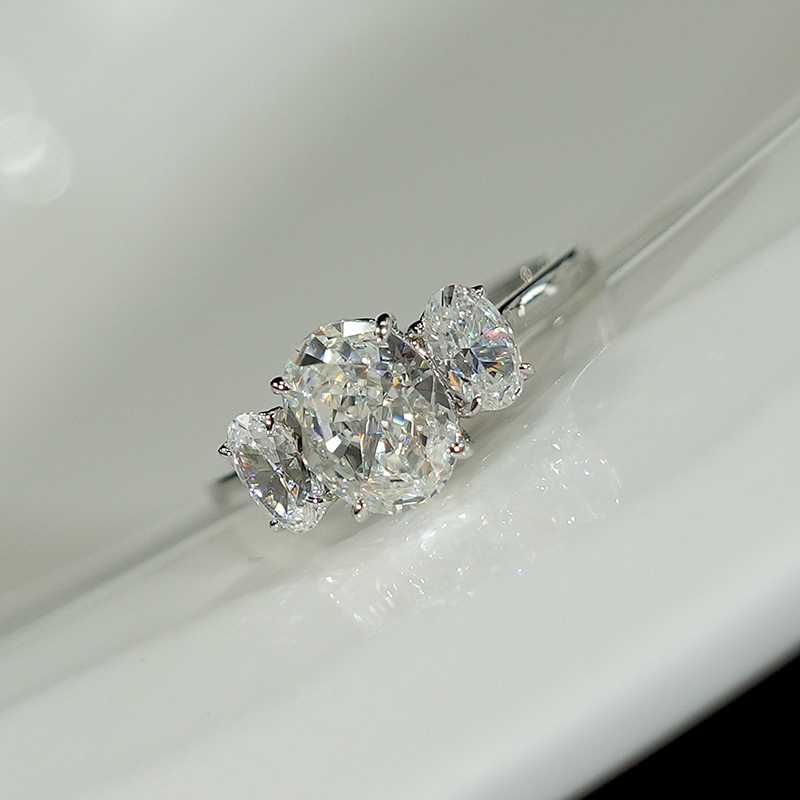 时尚通勤2克拉人造钻石戒指925纯银椭圆形三颗钻结婚仿真订婚戒指