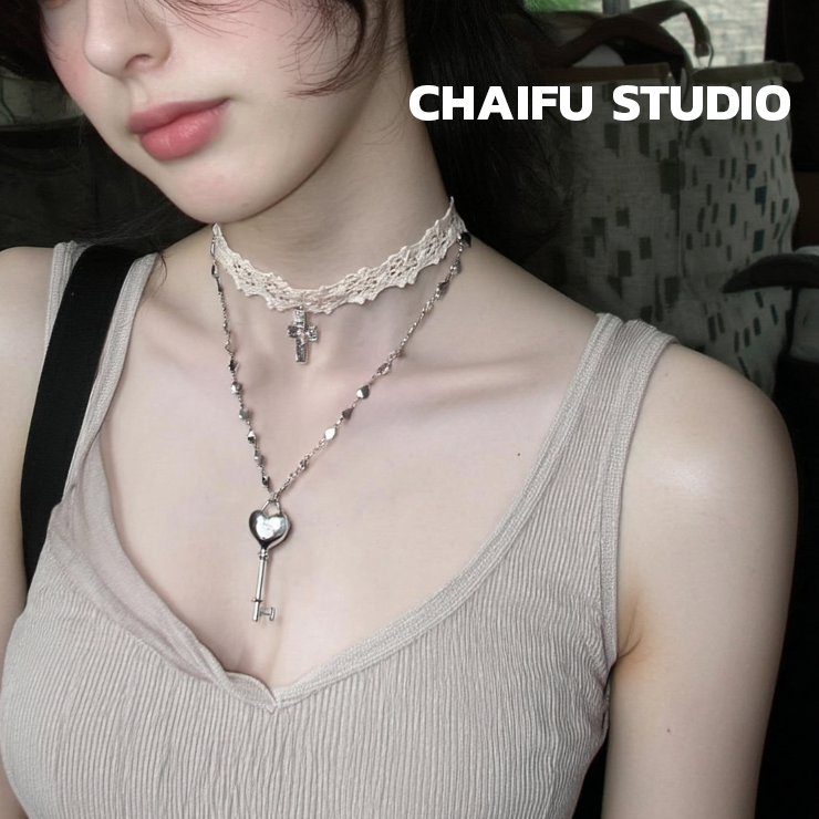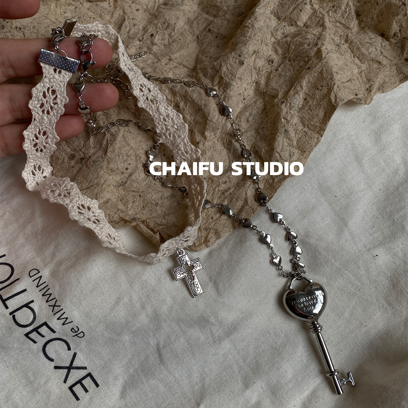 柴夫工作室/X787 韩系甜酷风刻字爱心钥匙项链Y2K叠戴蕾丝锁骨链