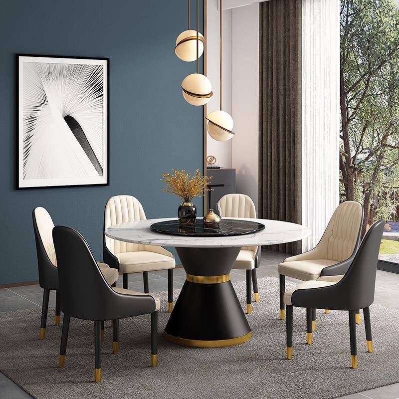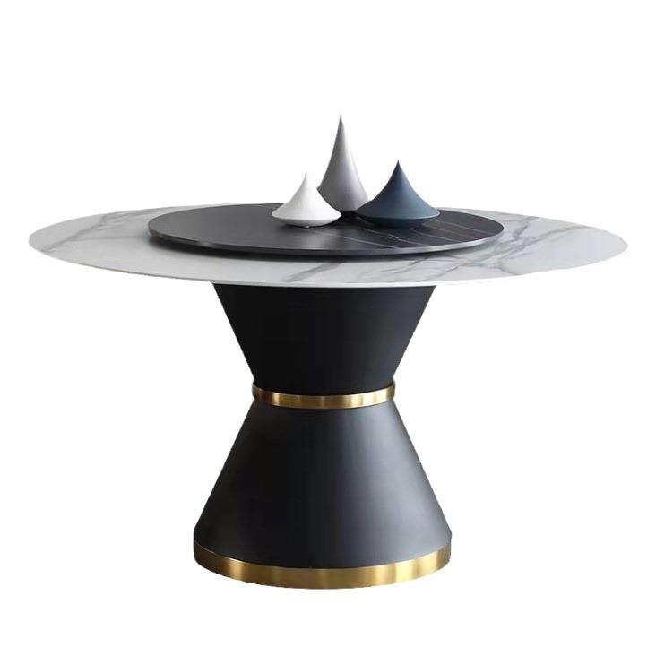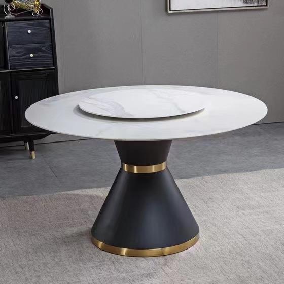 轻奢意式极简碳素钢岩板大理石餐桌时尚带转盘大小户型圆家用圆台