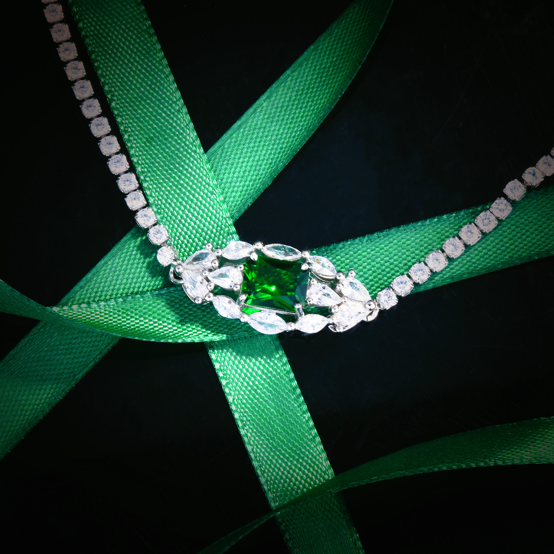 POLYSUTT新款百搭日常款彩宝项链 微镶满钻祖母绿色锆石短款锁骨
