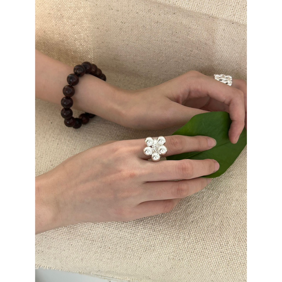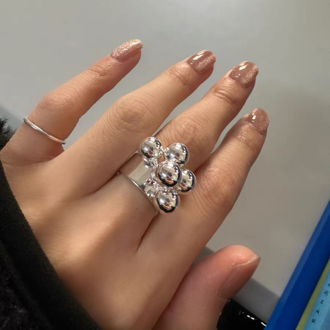 925纯银小银珠铃铛花戒指女个性小众设计时尚百搭亮银饰品开口
