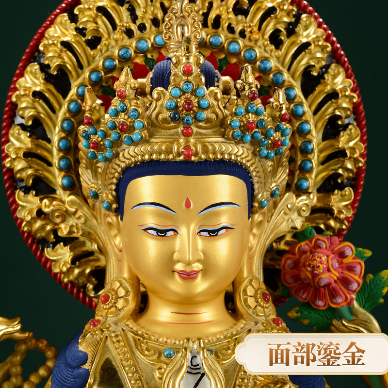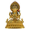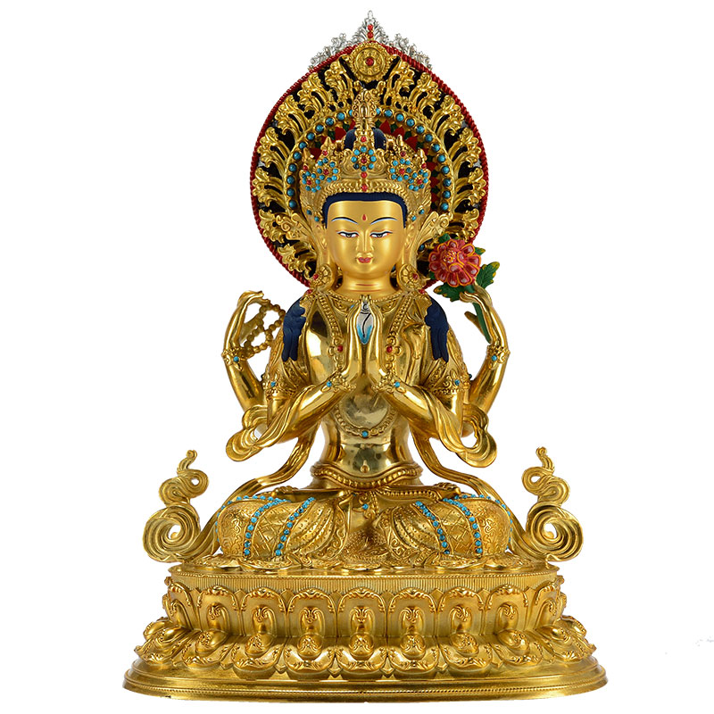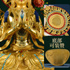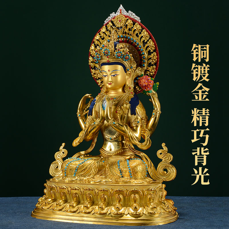 铜镀金四臂观音双莲花底座带背光居家桌面观音菩萨铜像11寸