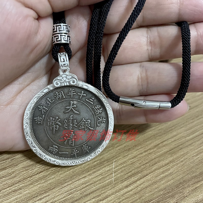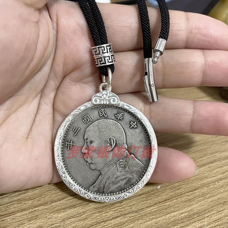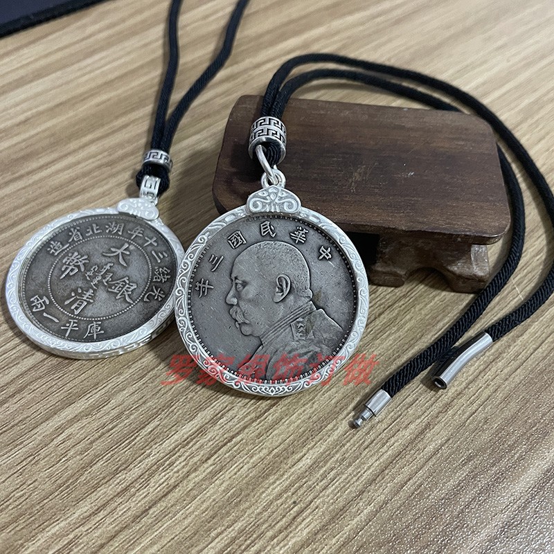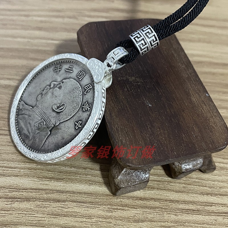 S990足银银元吊坠边框袁大头圈包边空托龙洋圈原创设计情回纹银鉓