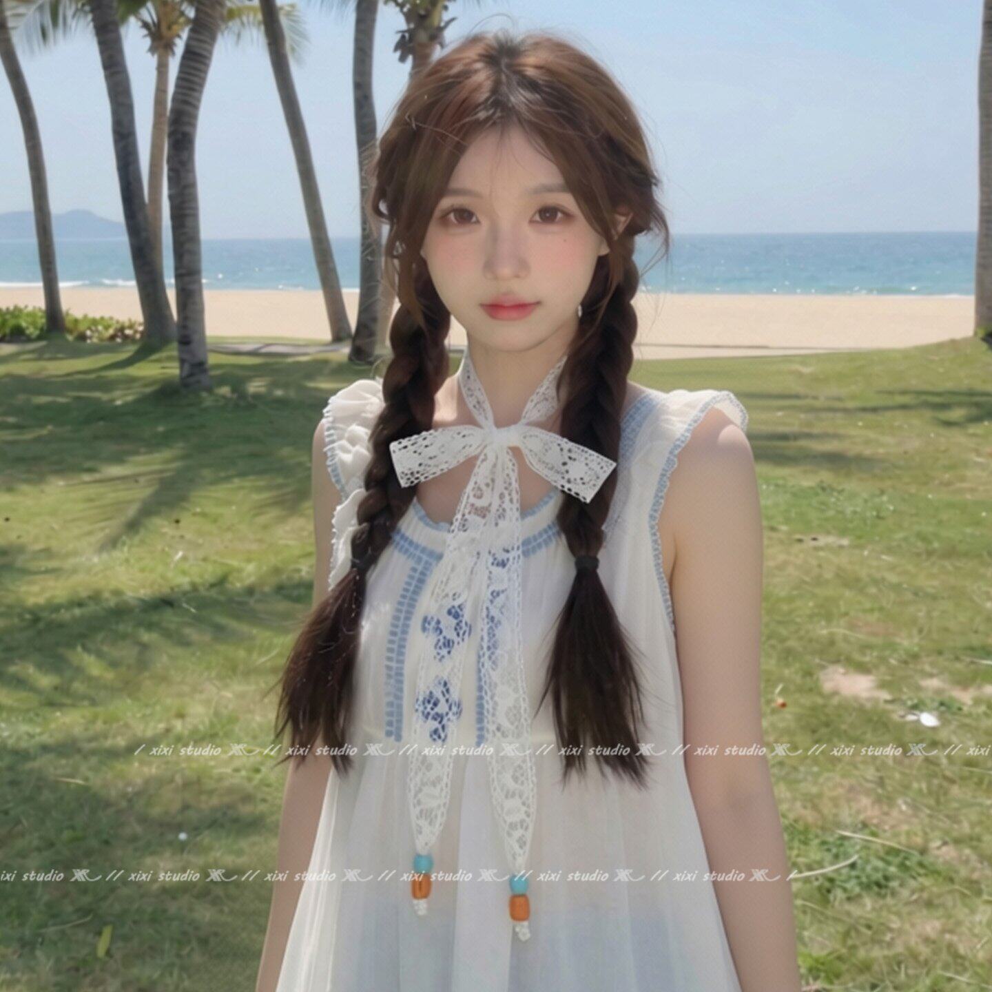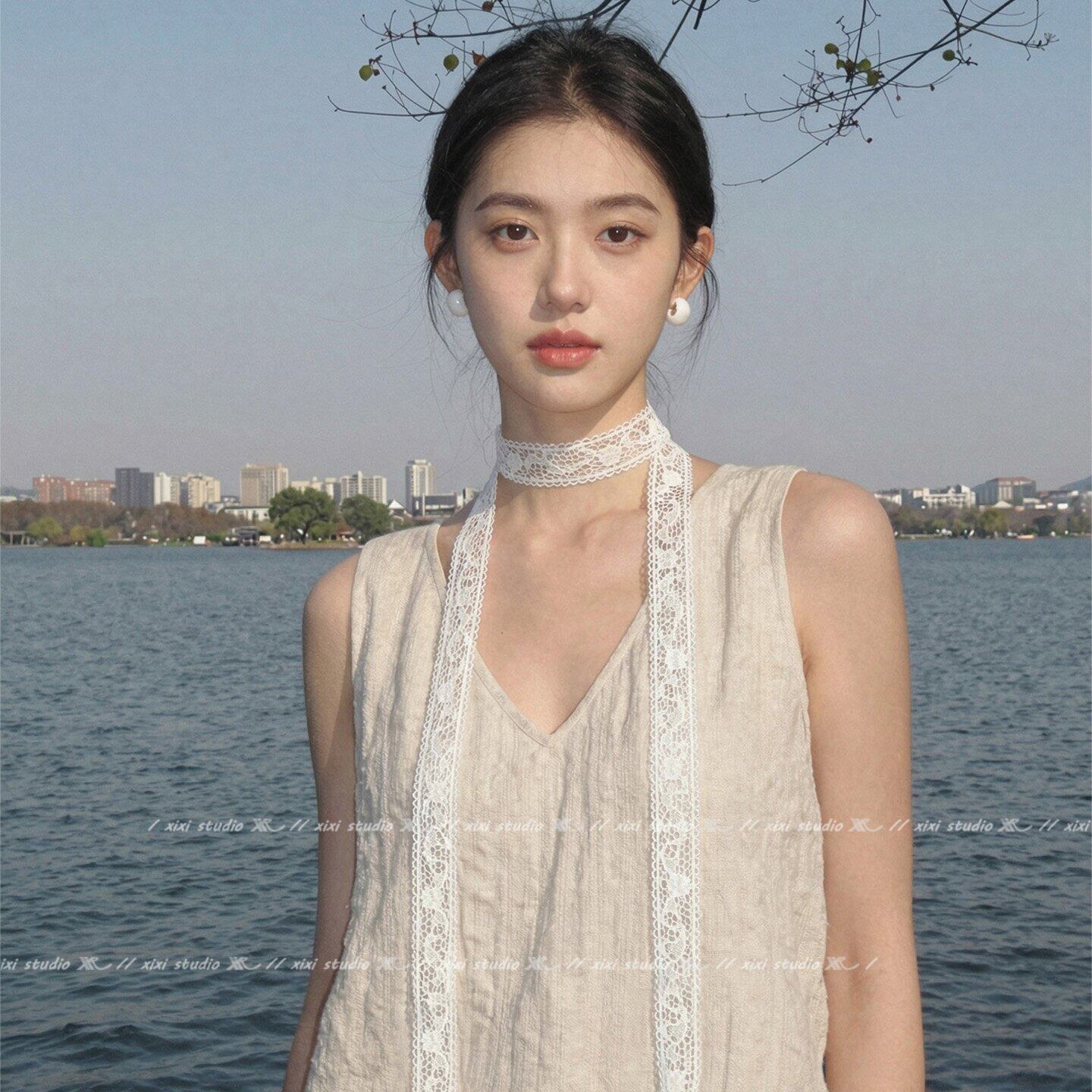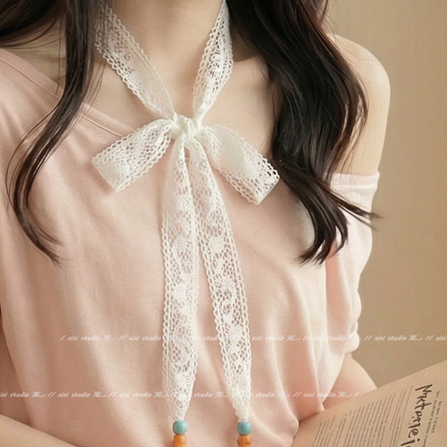 超仙白色蕾丝花朵串珠丝巾项链少女心挂脖颈饰甜美可调节颈带新品