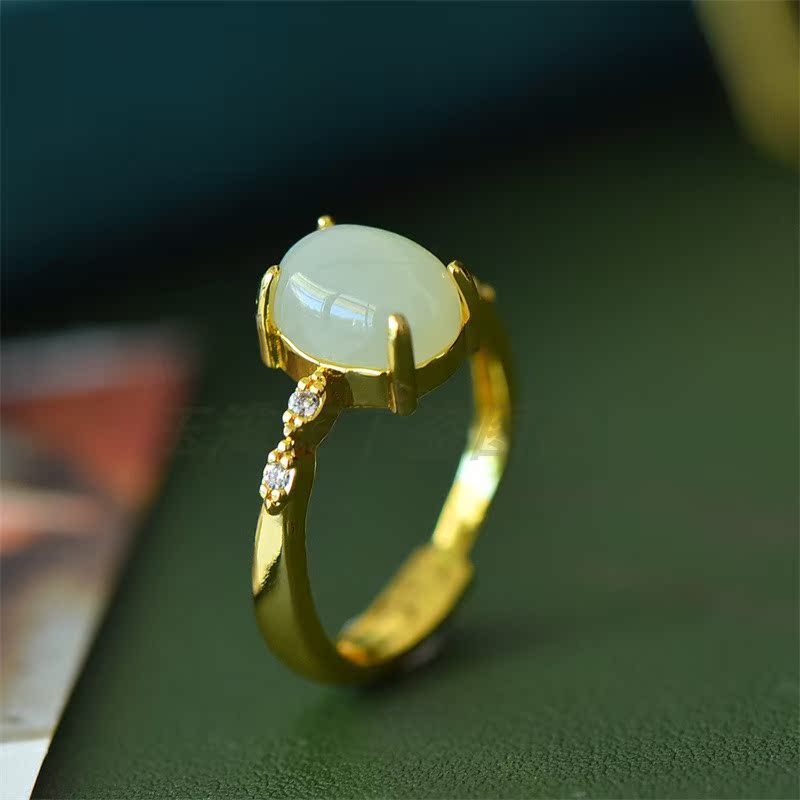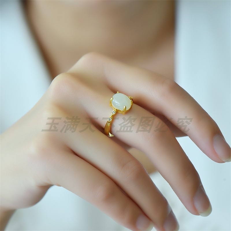 新疆天然和田玉白玉蛋面戒指女款玉石镶嵌指环活口可调节戒圈