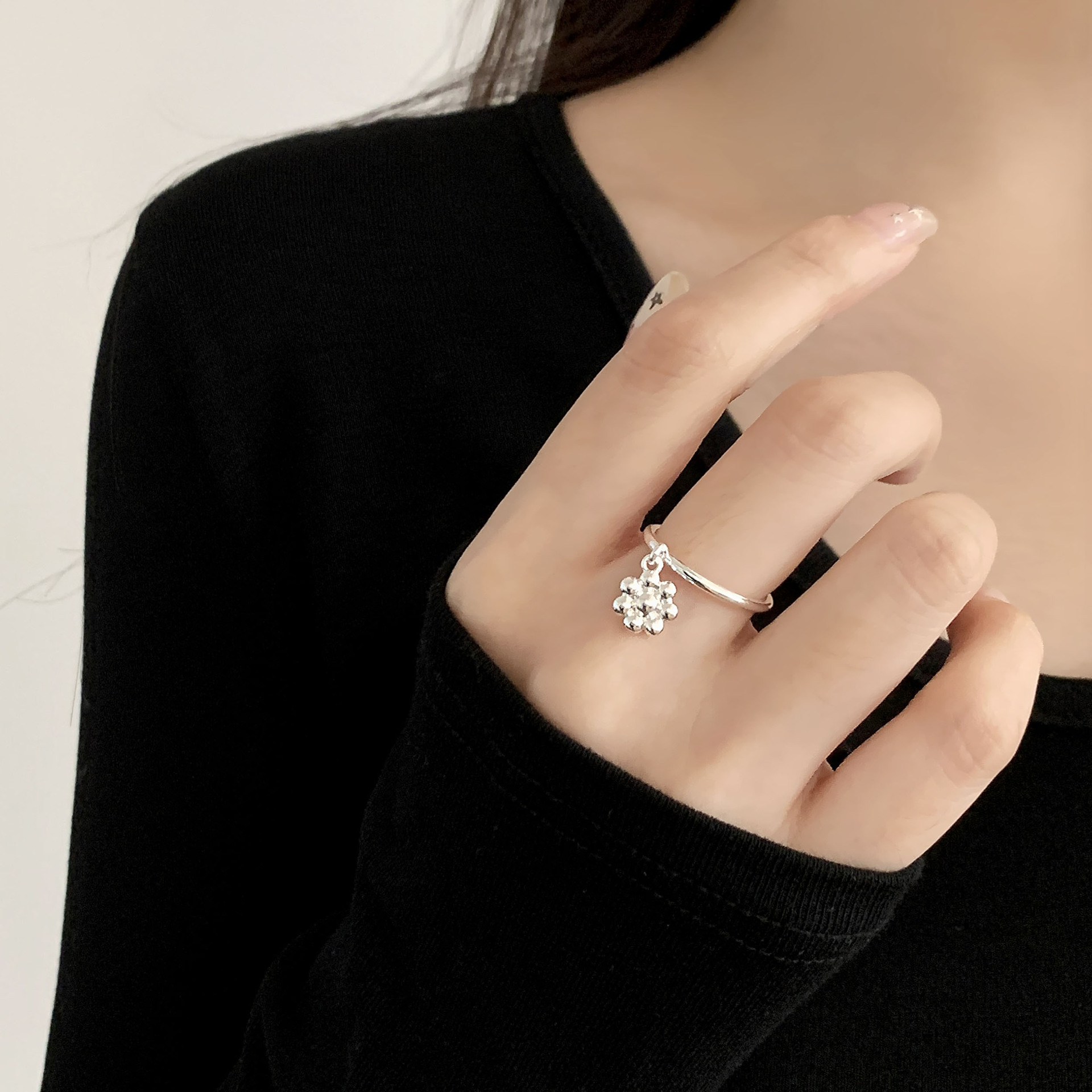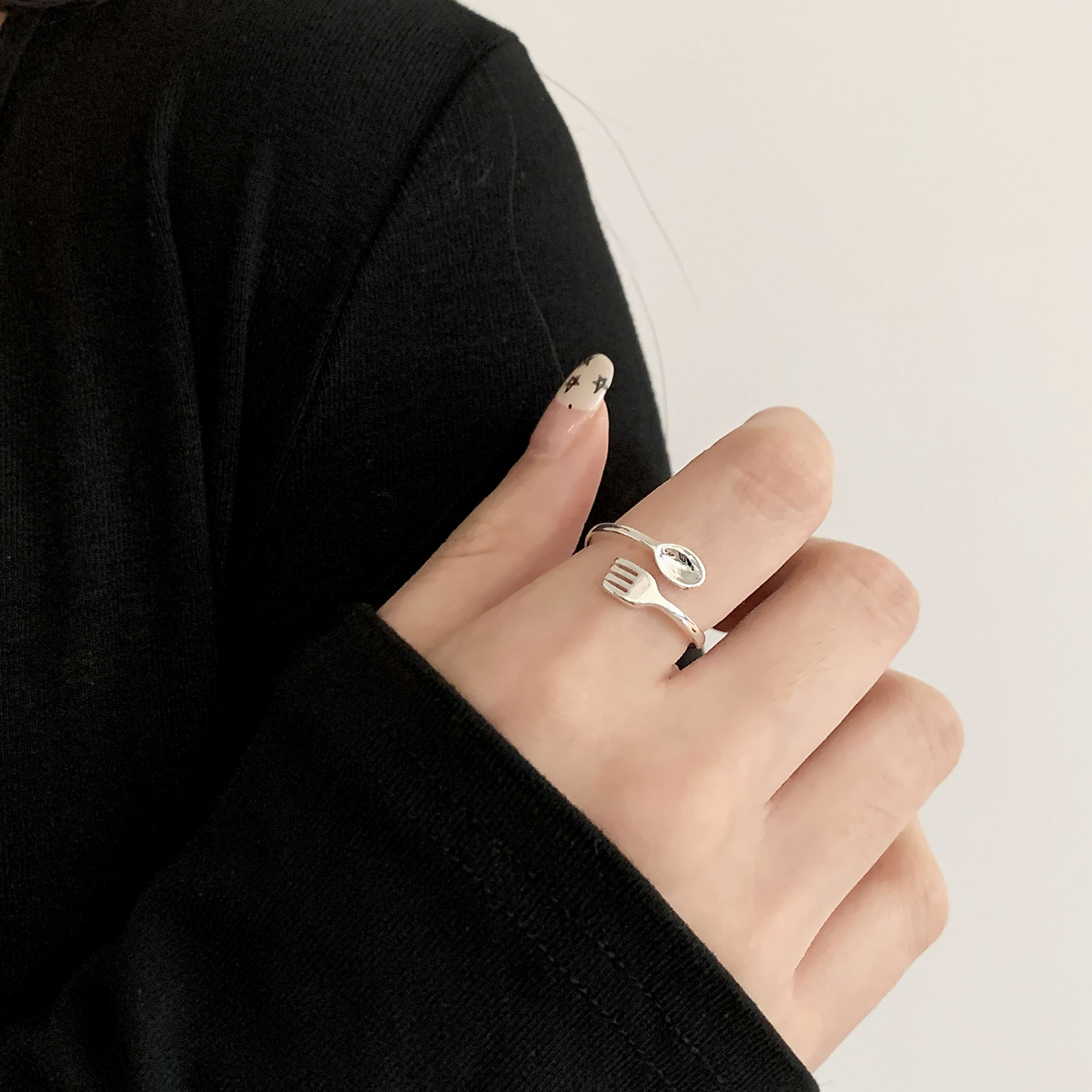 少女心小花球吊坠戒指女创意趣味迷你刀叉开口指环百搭个性食指戒