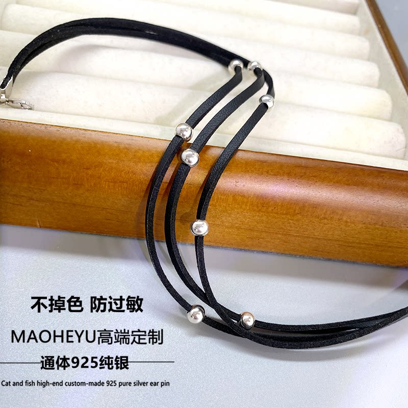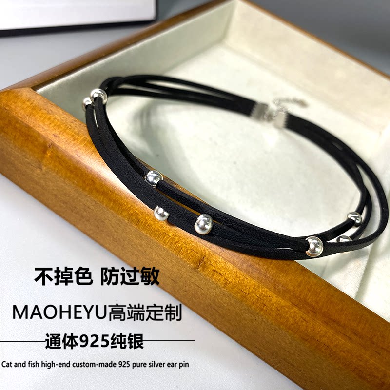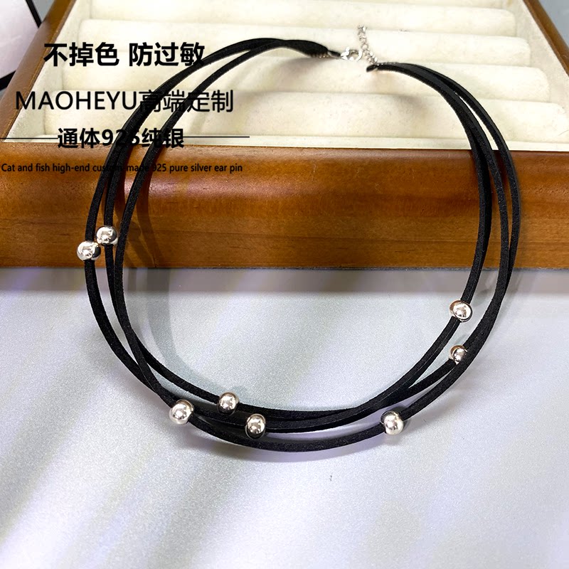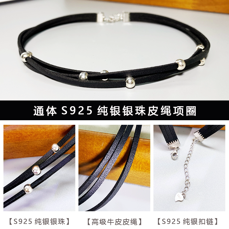 S925纯银高级黑色皮绳银珠项圈女choker颈链锁骨链小众设计甜酷潮