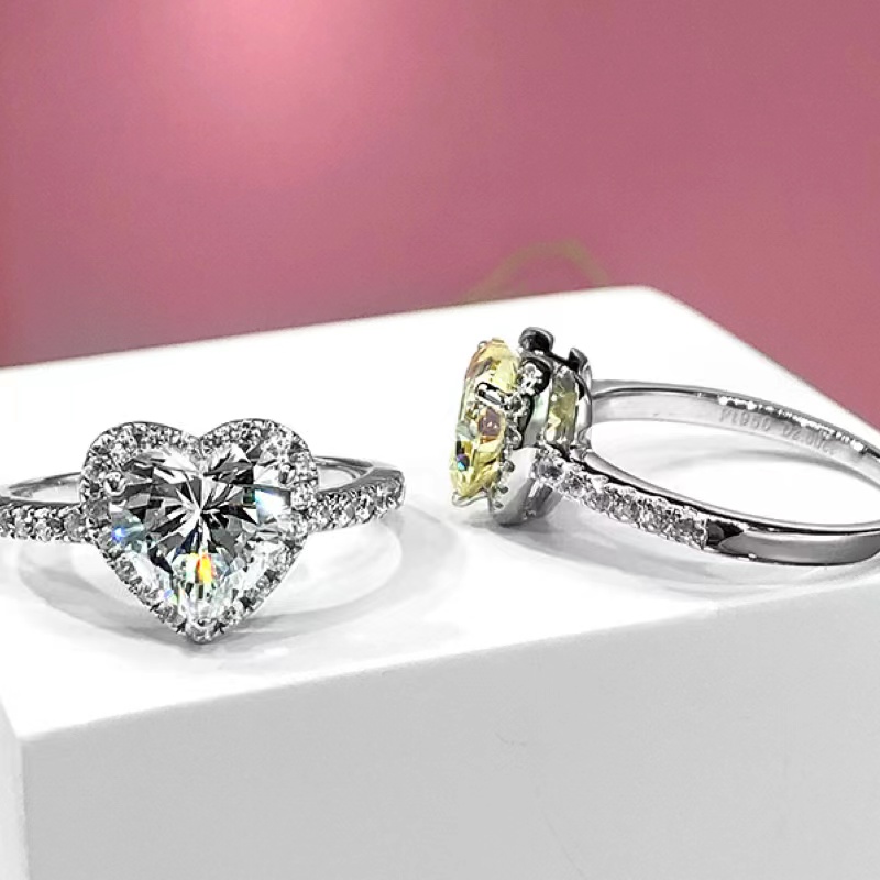 PT950铂金进口莫桑石D色爱心粉钻微镶黄钻心形指环简约甜美戒指