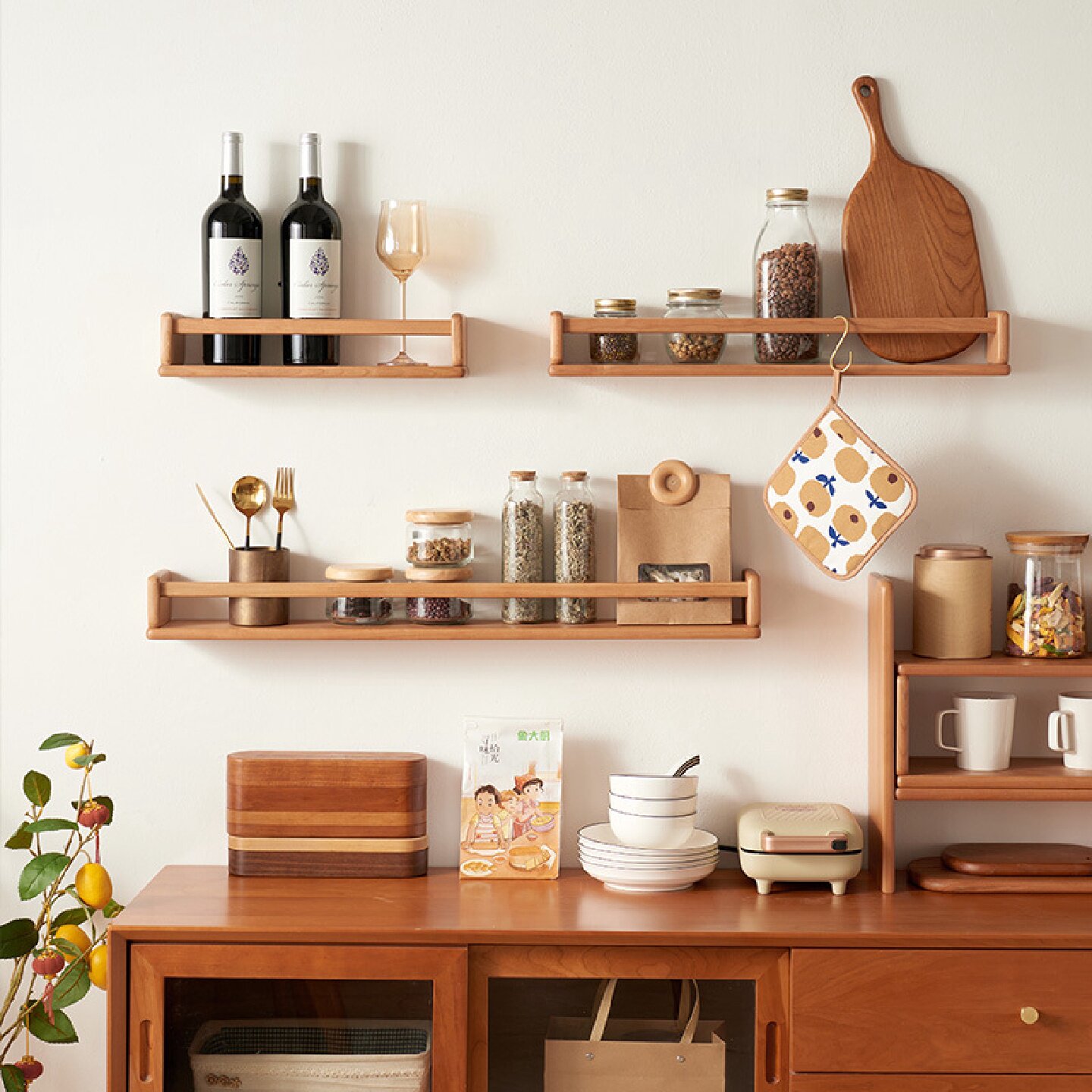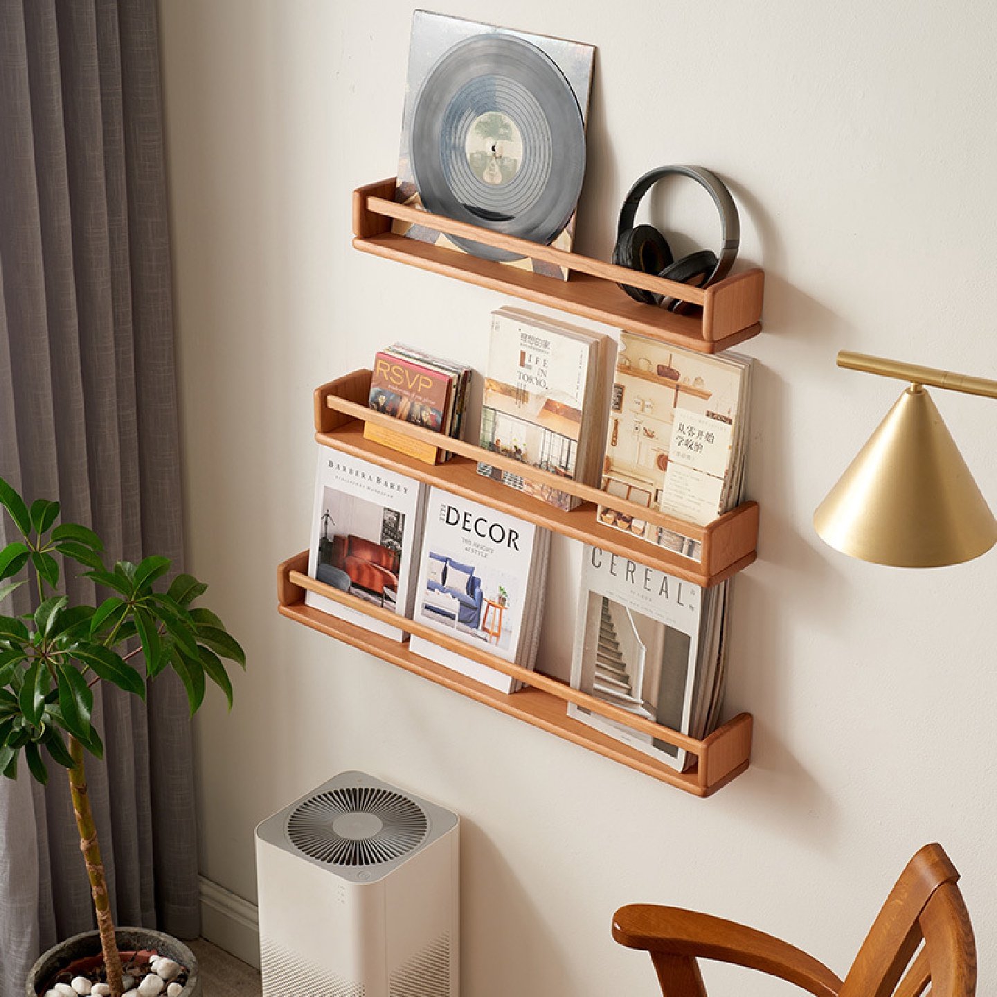 樱桃木墙上置物架免打孔实木书架杂志架客厅壁挂式木质绘本隔板