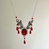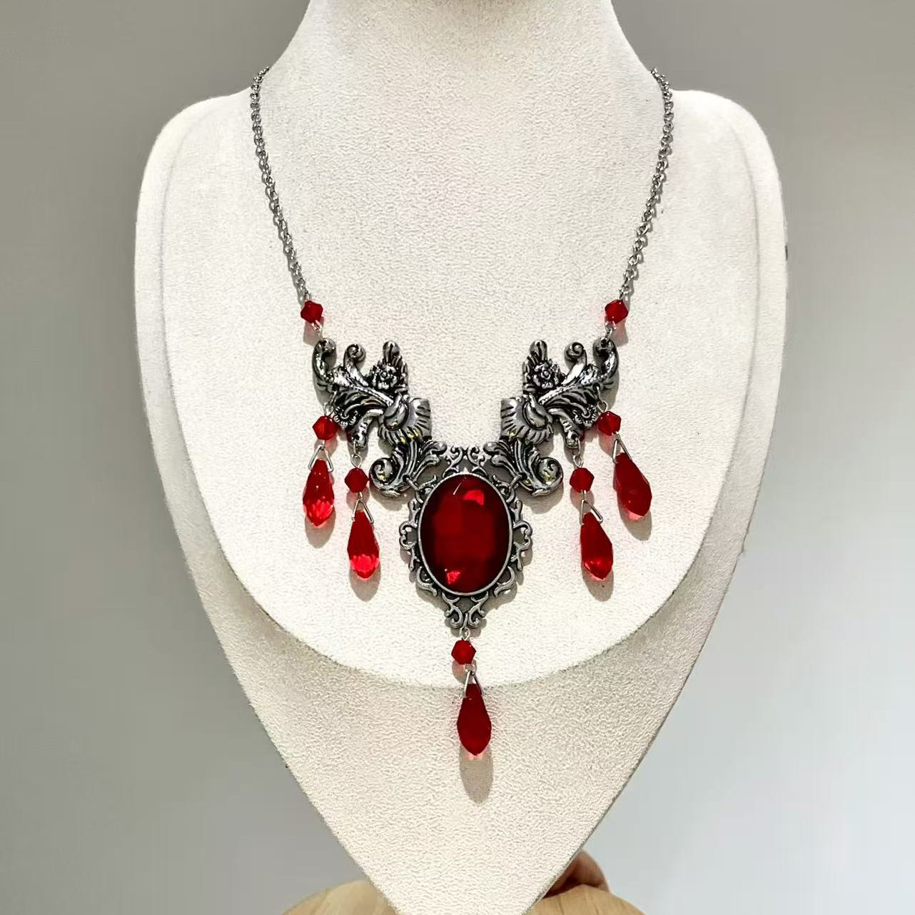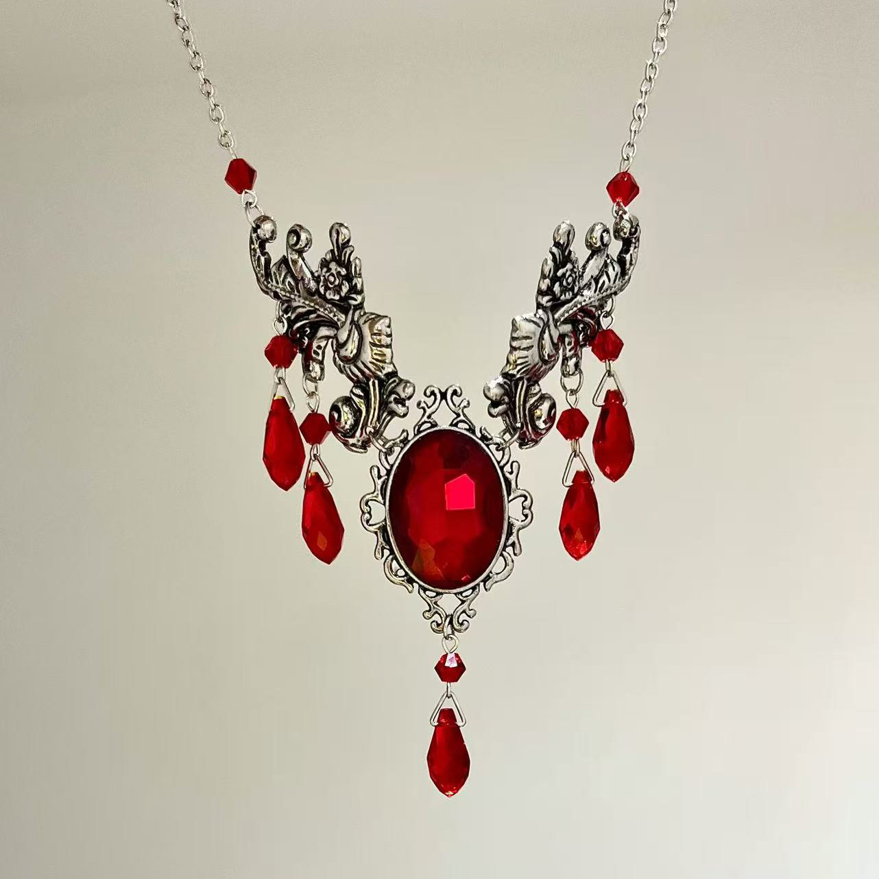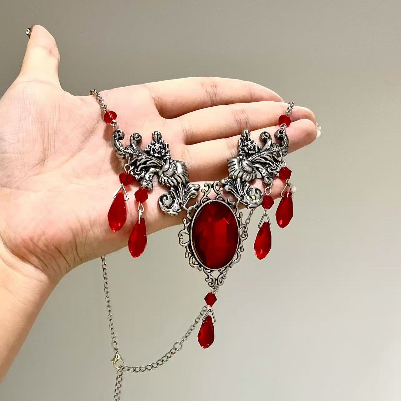 暗黑风做旧红色水滴流苏吊坠项链女万圣节复古气质仿宝石锁骨链