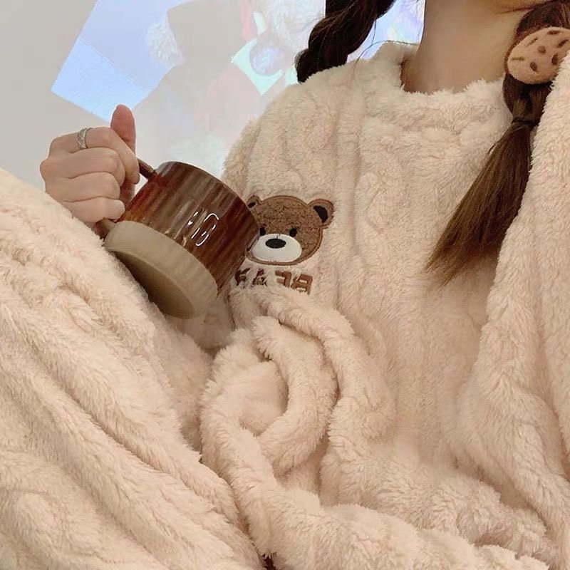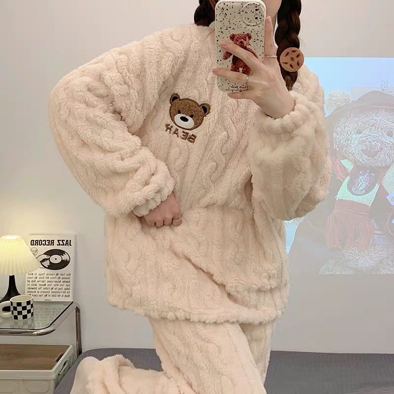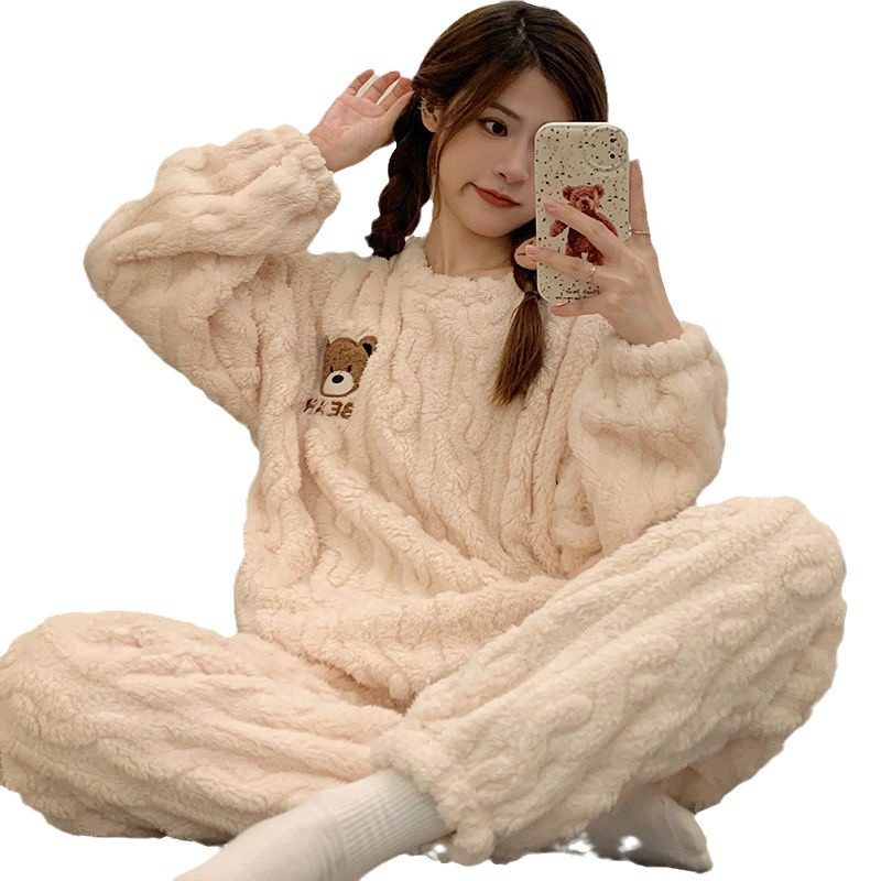 冬季剪花绒加厚睡衣女长袖爆款保暖加厚加绒睡衣加绒家居服女套装